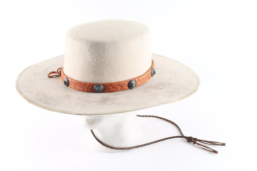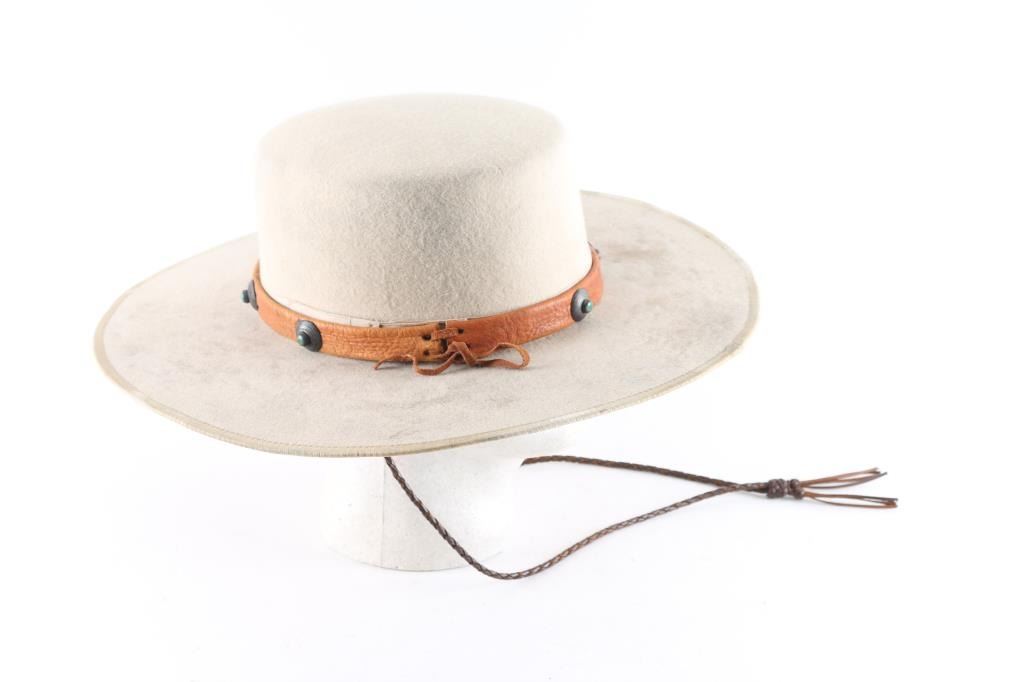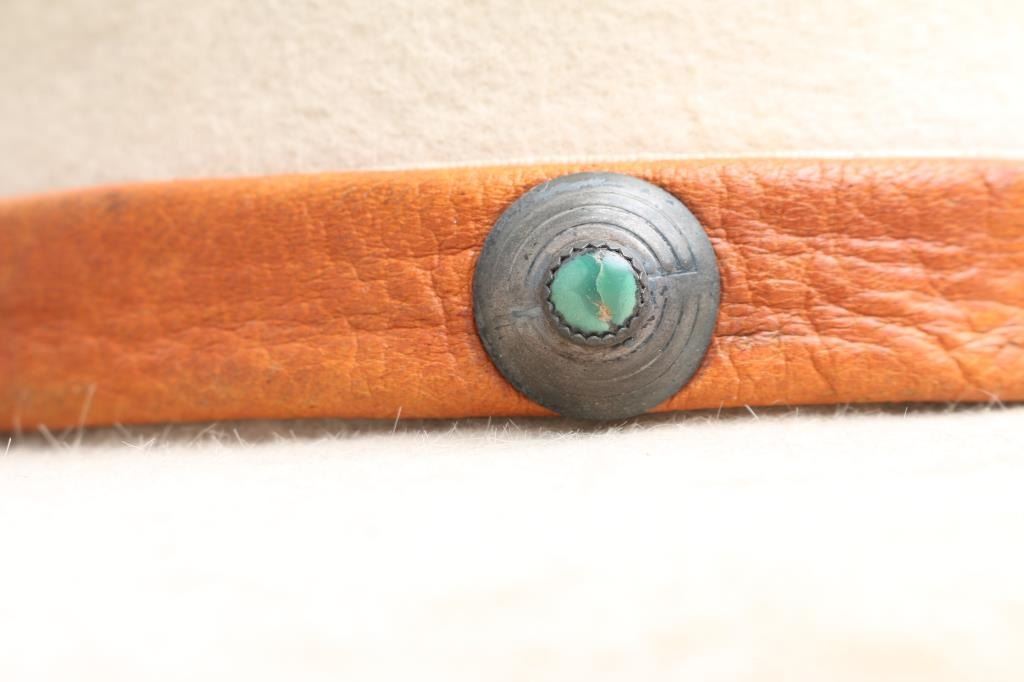 This Fort Western-style hat with a leather hat band mounted with silver handmade conchos with turquoise in the center. Joe Musso Estate (Santa Fe 1970's obtained when on location.) Size 7 1/4 to 7 3/8. Good Condition.