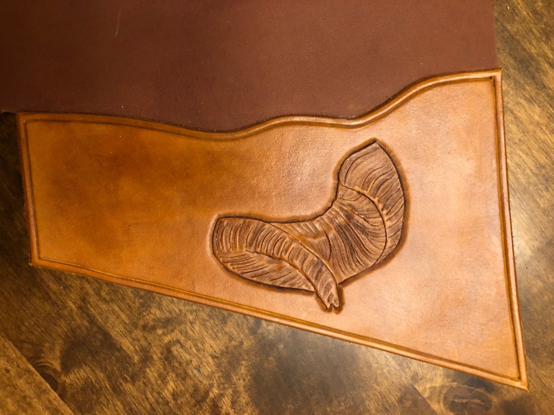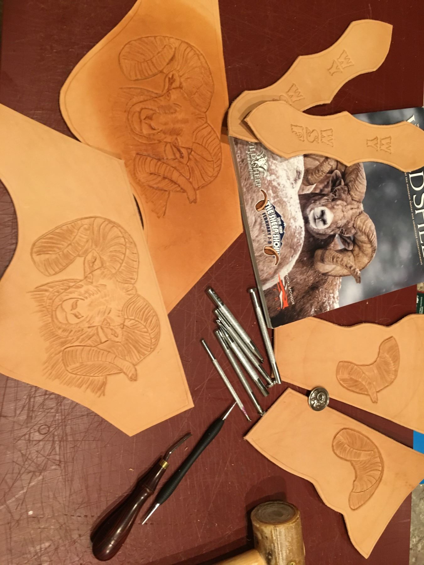 Featuring the new world record ram head (216 3/8”) hand tooled on the yokes and his massive horns on the back of legs. WY WSF initials on the sides of legs of chinks. Ram head conchos used throughout. Will fit persons with waist size from 32 - 36, with adjustable waist and thigh. Highest quality heavy leather. One of a kind / original item. 1 of 1.