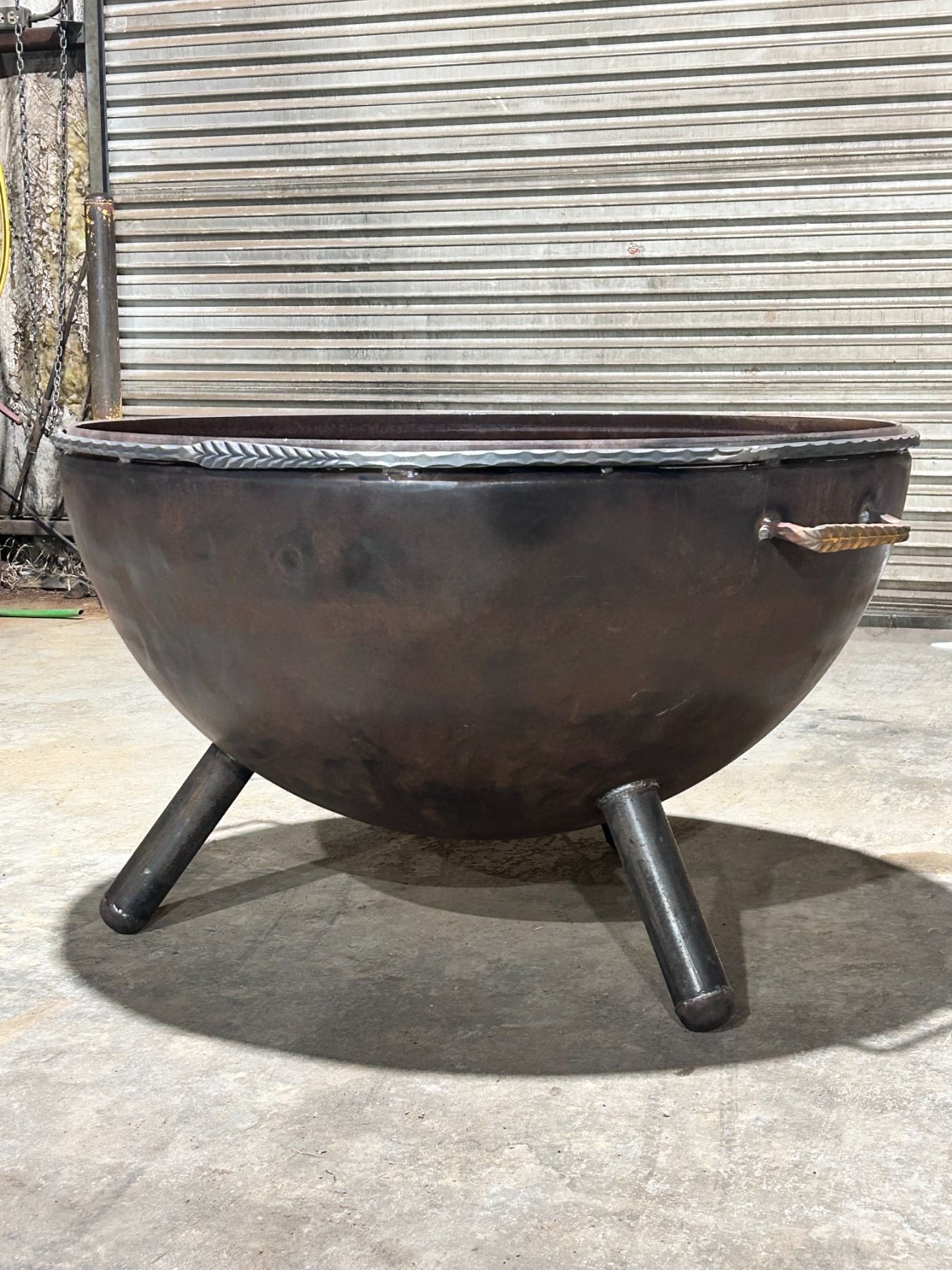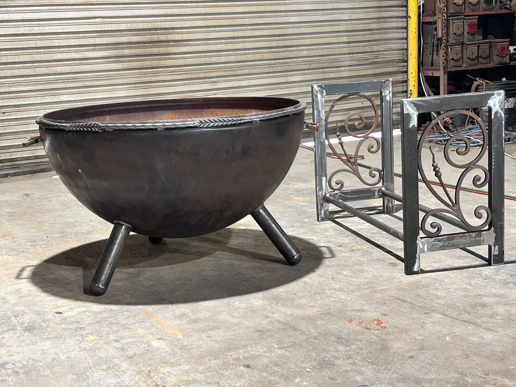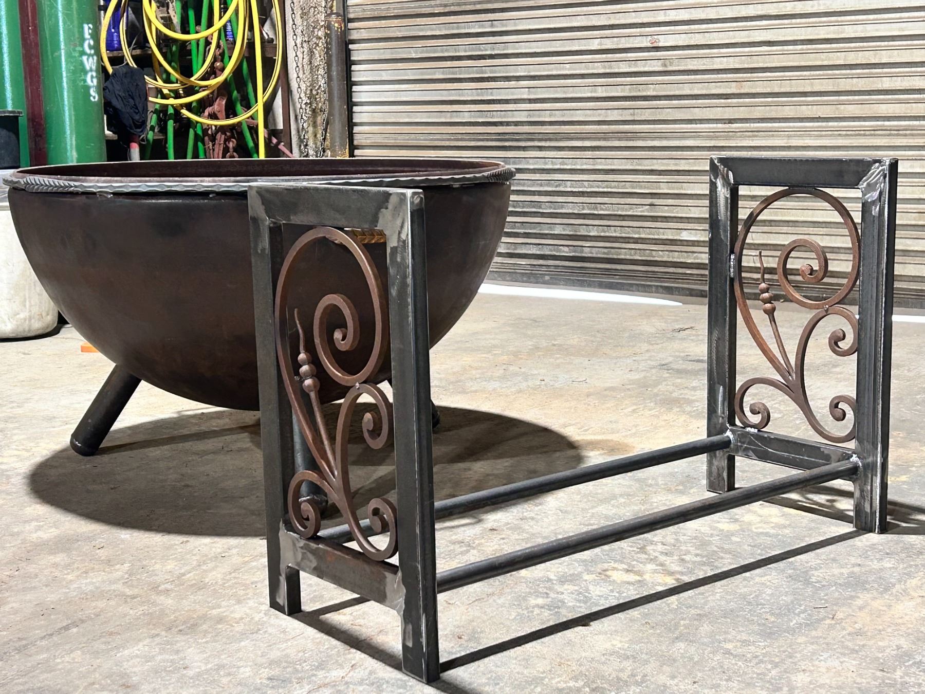 One of a kind custom built fire pit and wood rack, perfect for your next back yard get together.