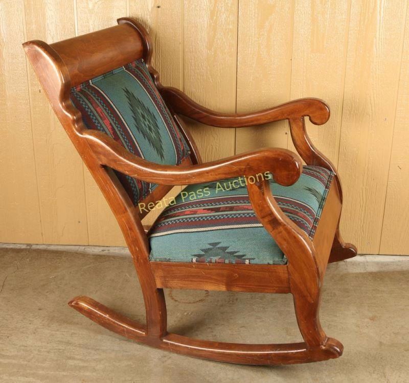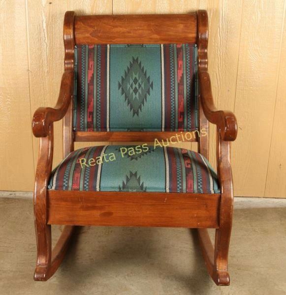 Large size with solid oak construction with a deep green southwest pattern, very comfortable.