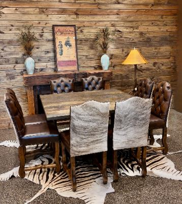 With gratitude to Bison Creek Interiors for this generous contribution, this custom-built rustic barnwood table and Shiner barstool set embodies the artistry and authenticity of handcrafted American furniture.