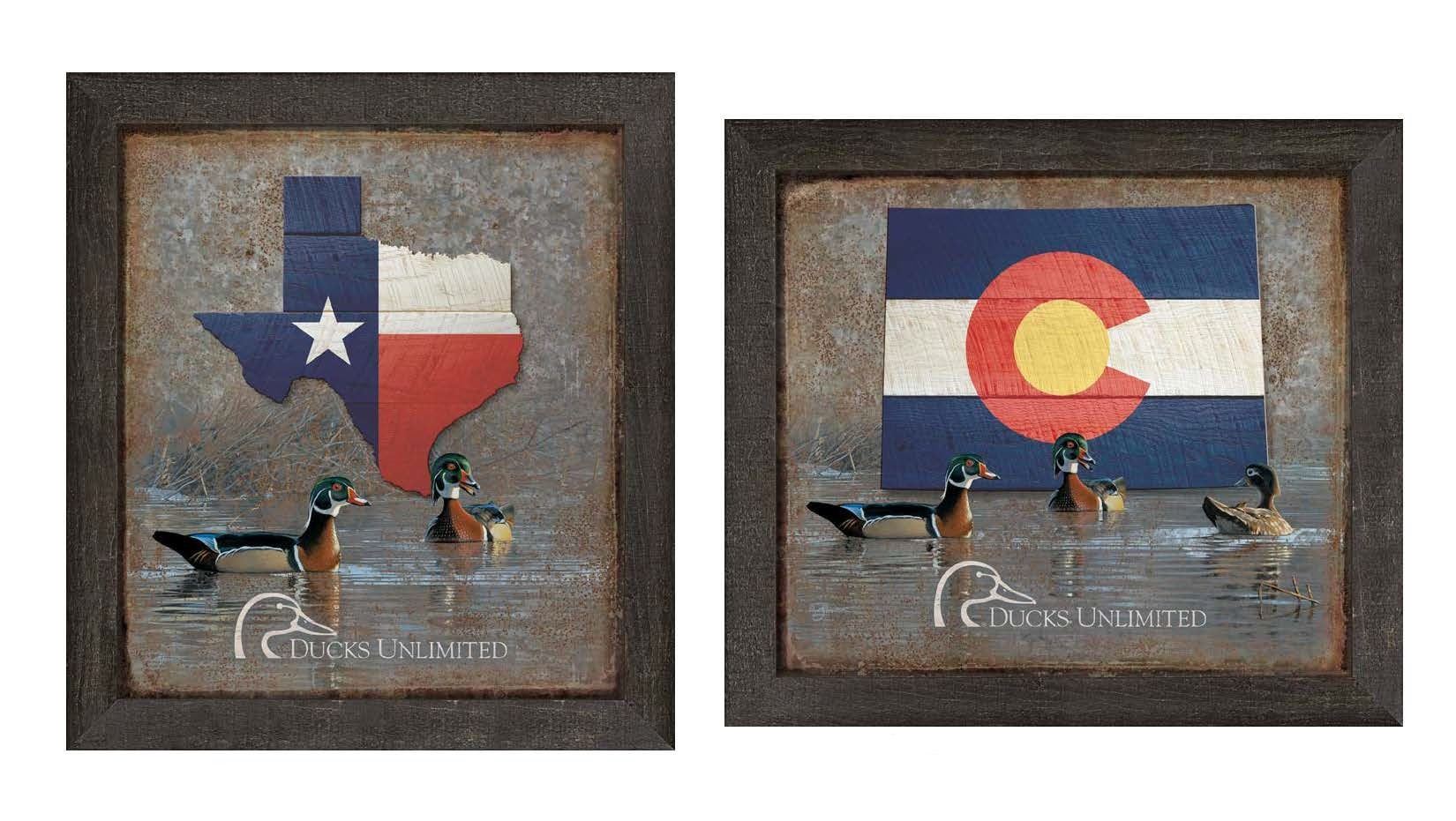 The Custom State Flag Framed Tin Sign features customized state artwork filled with the state flag. It is a framed tin sign with wood duck artwork by Scot Storm, the DU logo and the state of your choice. It includes a 2 ¼” rustic wood frame with a black wash. Both horizontal and vertical presentations are available based on the state orientation. It is made in the USA and measures 26”x 29.