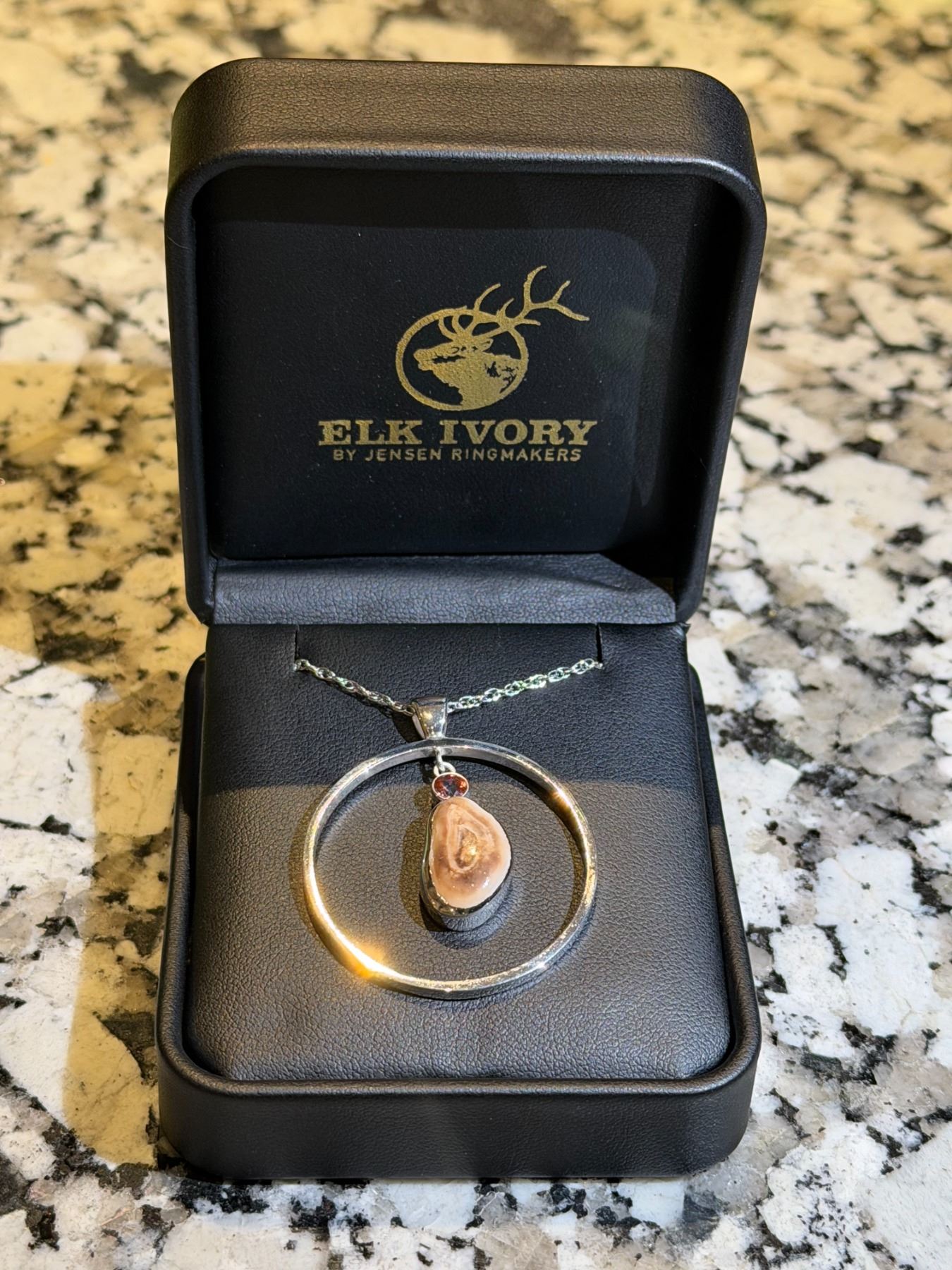 Elk ivory comes from elk teeth, remarkable remnants of prehistoric tusks, and has long been prized for its unique beauty and connection to the outdoors. Jensen Ringmakers has built a reputation for creating elk ivory jewelry to exacting standards, using exceptional materials and craftsmanship that collectors and sportsmen alike admire. Elegant, meaningful, and highly collectible, this pendant makes a memorable gift or personal keepsake for anyone who values the beauty of wildlife, the outdoors, and fine jewelry. Valued at $2,000, this is a rare opportunity to own an heirloom-quality piece.