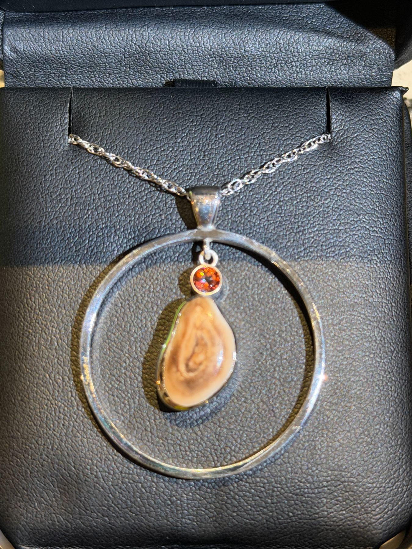 One (1) of 12 custom-made “Sun Aura” Elk Ivory Pendants featuring Continuum Metal, genuine elk ivory, and “Sunset” topaz.
