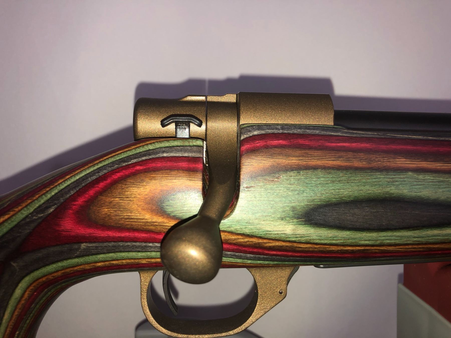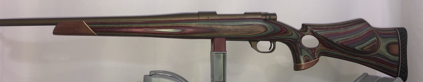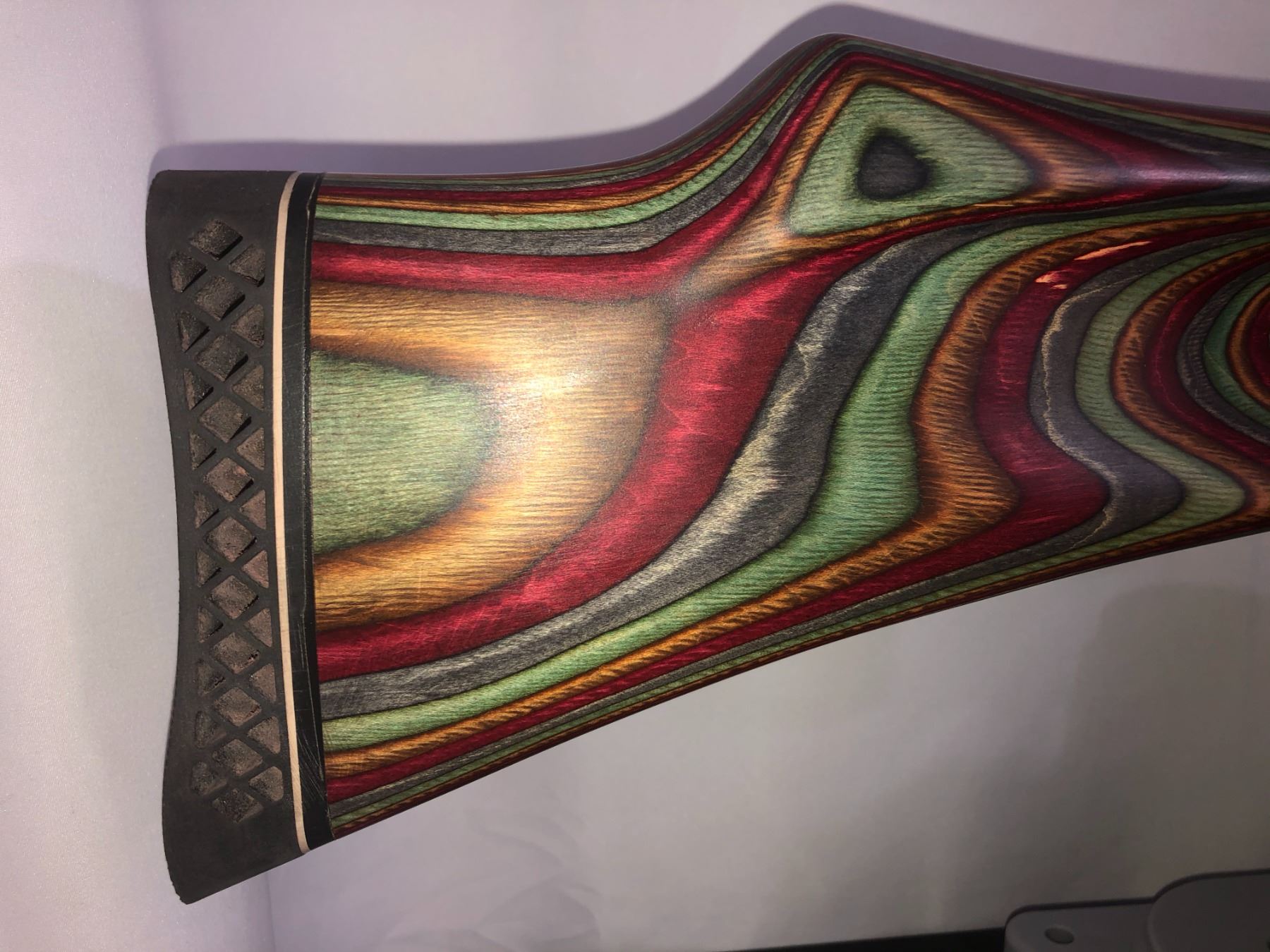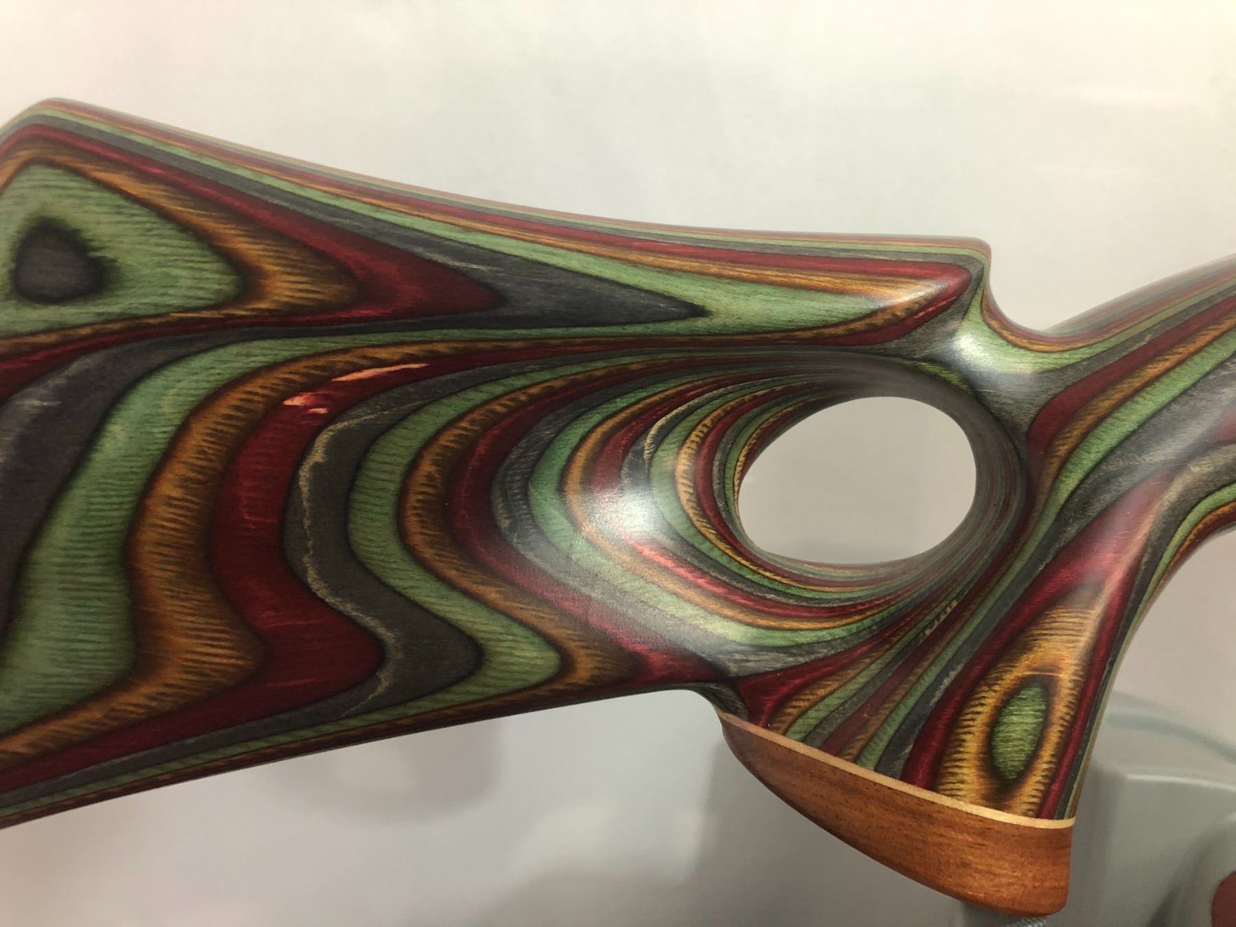 The rifle sits on Richards Monte-Carlo thumb-hole stock with Rich Colors of Burgundy, Green, Brown, Gray & Charcoal . The forearm and pistol grip cap is in rich rosewood to give the stock an overall WOW Factor look.