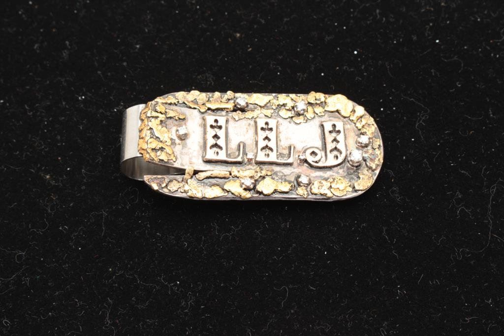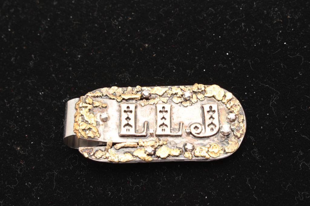 Multi-color nuggets on silver with rose gold and small diamonds. Shows the initials L.L.J. Marked 22K and 14K with illegible signature on the silver and stainless clip. Very, very nice. Est.: $175-$350
