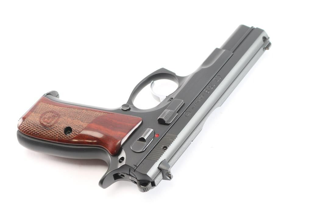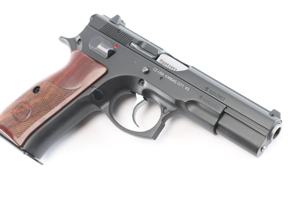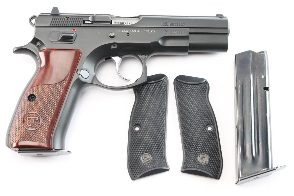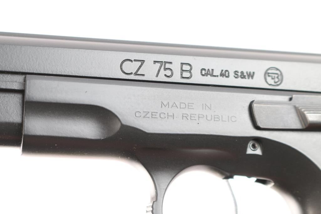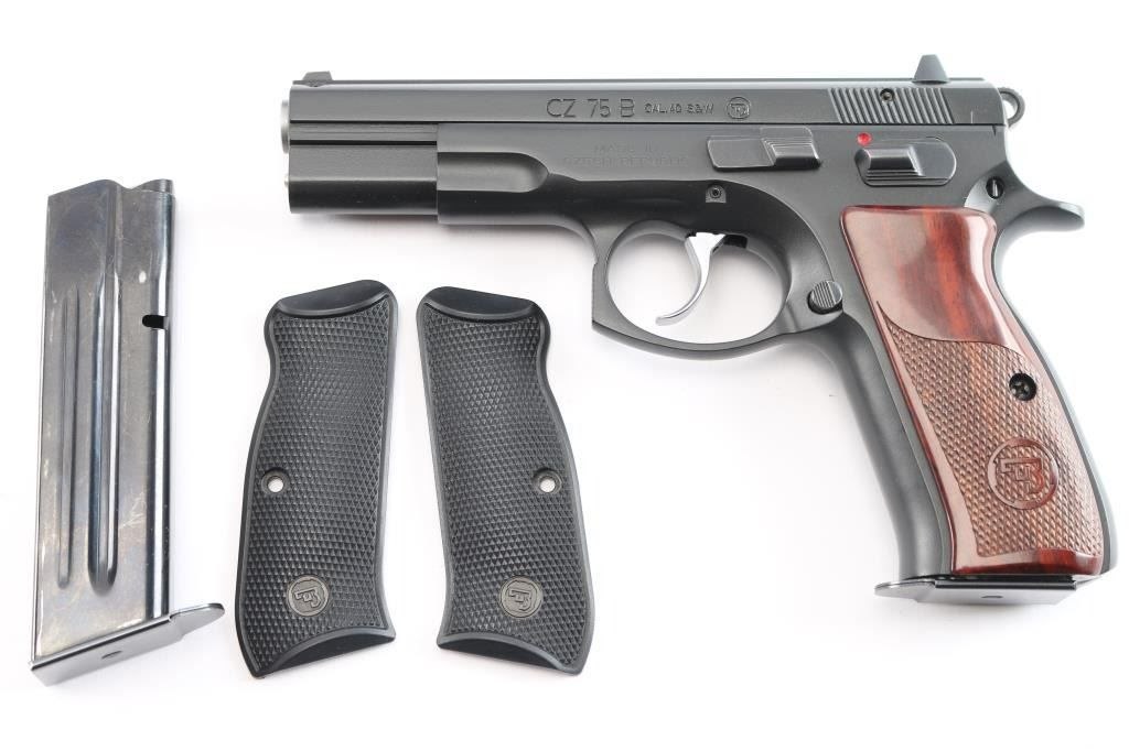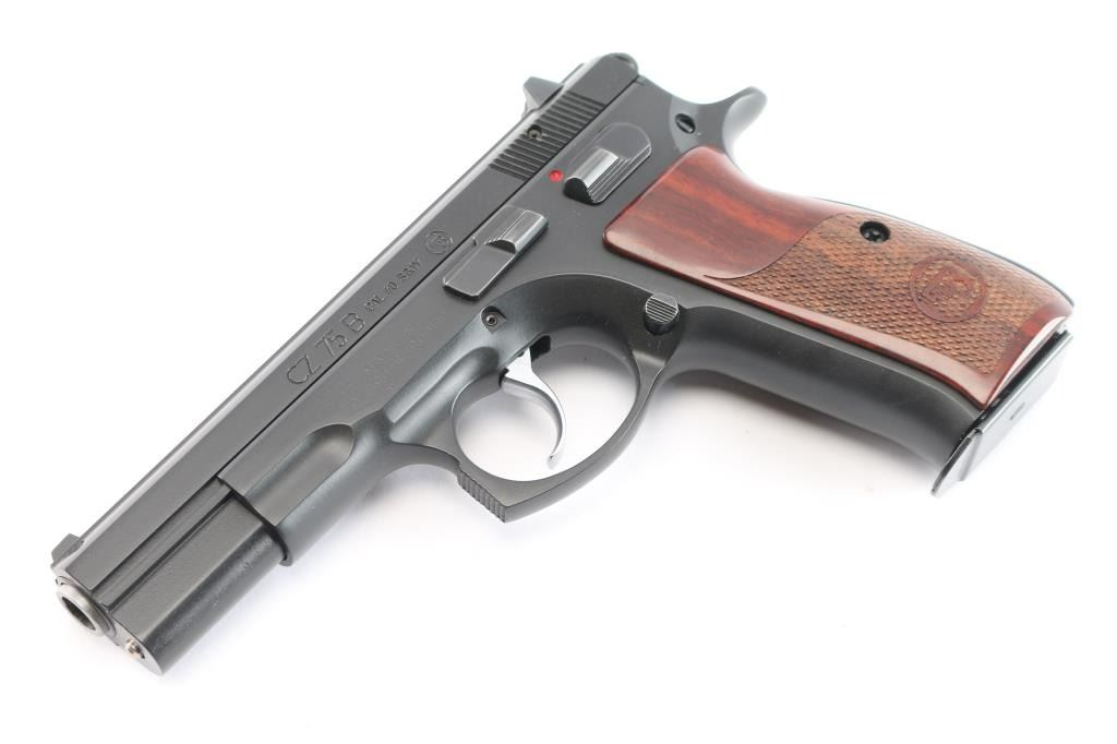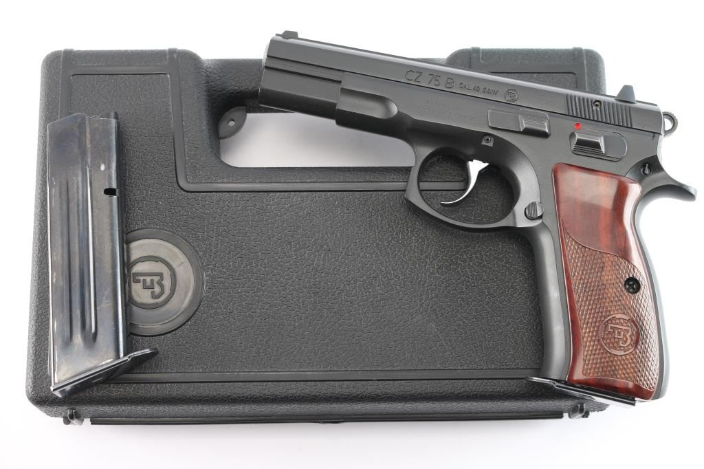 Czech made DA/SA semi-automatic pistol chambered in .40 Smith & Wesson. Imported by CZ-USA of Kansas City, K.S. with import marks on the right side of the frame. Features a matte black Polycoat finish, 4.5" barrel, 3 white dot sights, front sight with drift adjustable rear sight, smooth silver tone trigger, serrated round hammer spur, frame mounted safety, steel frame, push button magazine release, two-piece checkered wood toned polymer grips with CZ insignias, combat triggerguard. Bore is excellent/bright. Retains 99% finish. Grips are excellent. Like new condition. Two magazines, 15 rd capacity. Numbers match on frame, slide, barrel. Comes in factory hard case in sleeve with checkered black polymer factory grips, manual, cleaning gear and 3 spare main springs.