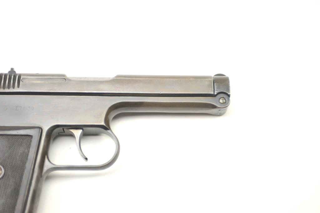 Czech Pre-Nazi Military Issue Semi-Auto pistol by CZ, S/N 252997. Shows EZ-39 marked with Czech lion proof. The blue has drifted to gray brown with traces of blue at the edges and where protected. Sharp grips.Original mag with fair to goof bore showing wear. Double Action only and oversize for this caliber as these are an unusual pistol. Used shortly by Czech military and cavalry before Nazi blitz. (No import marks).(C&R/PPT) Est.: $300-$600