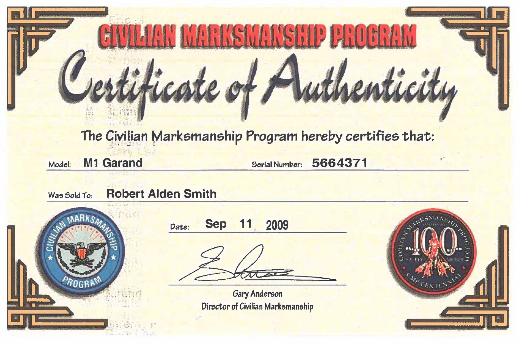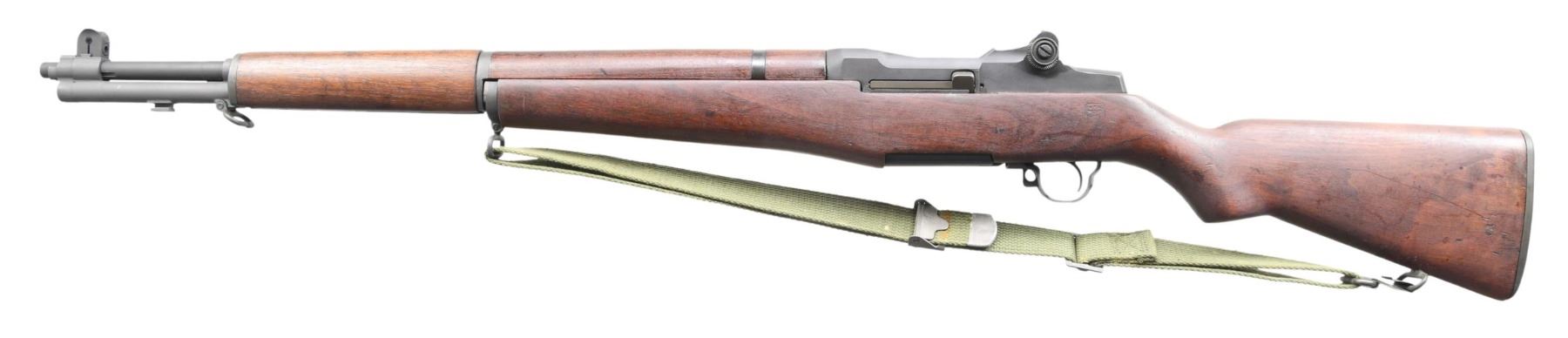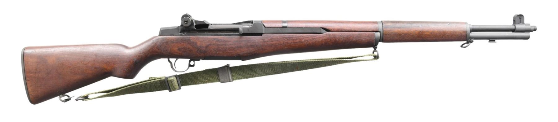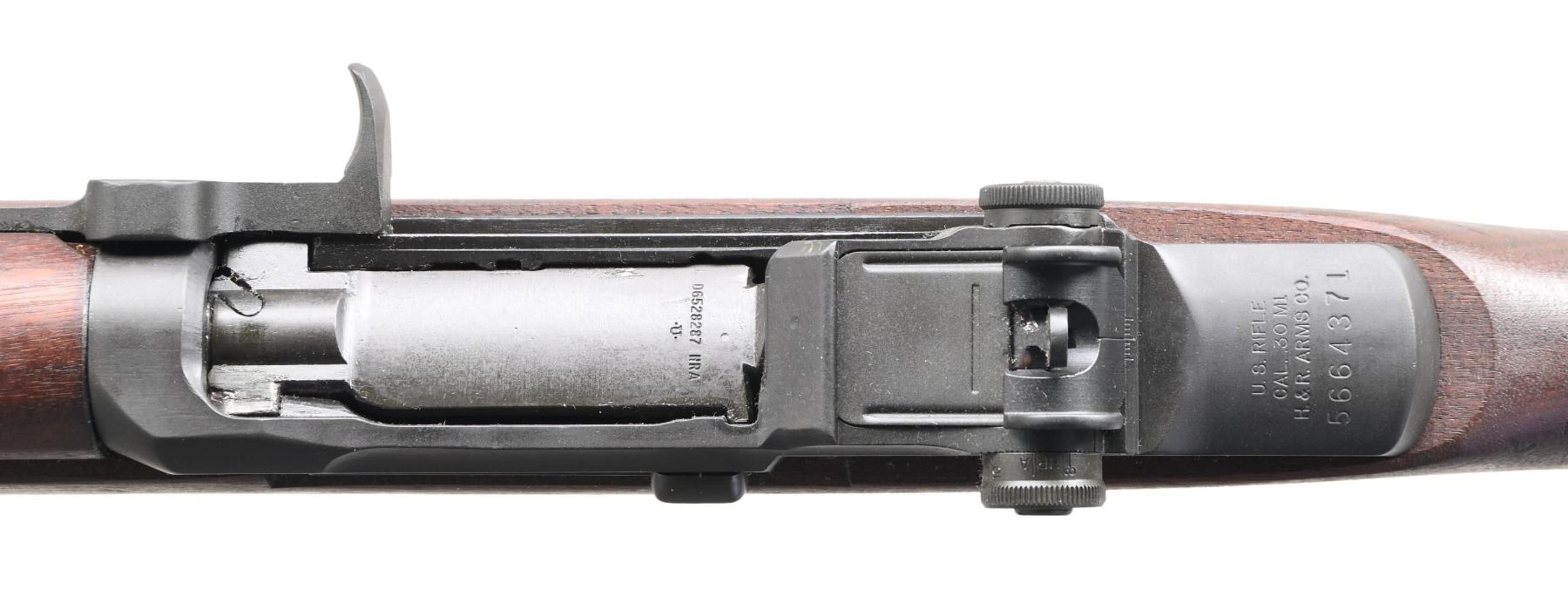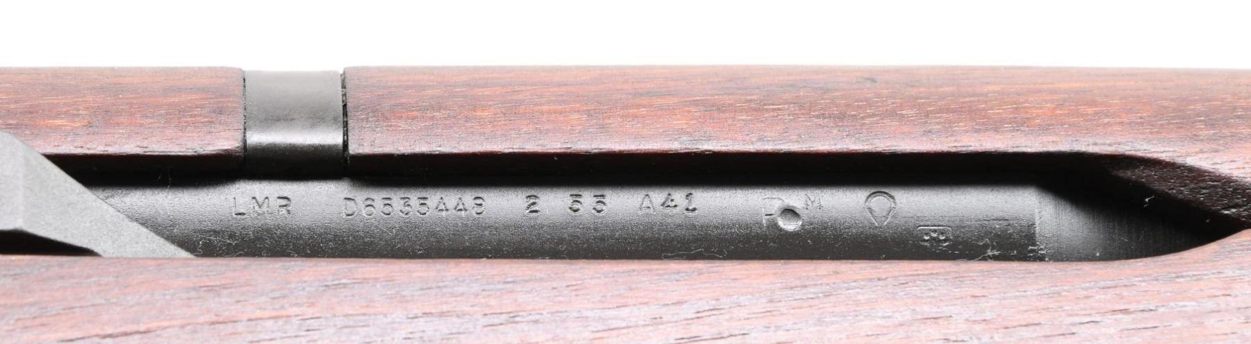 SEMI-AUTO MILITARY RIFLE FROM CMP. Cal. 30-06. S# 5664371. Bbl. 24". "LMR" barrel which was used on late production rifles. Barrel markings include "LMR" "2 55". Throat and muzzle gauge 1.0. T105E1 aperture rear sight. Knobs are "HRA". Blade front sight with protective ears. All major parts markings are "HRA". Hi-hump gas cylinder lock. Stamped trigger guard. Walnut stock set. Buttstock is marked on the left side with boxed " Defense Acceptance Eagle". Marked under grip with encircled "P" proof. Green web sling. UNNATTACHED ACCESSORIES: matching bill of sale and Certificate of Authenticity. Certificate is signed by Gary Anderson. Also includes checklist and owners manual. CONDITION: wood and metal have high quality arsenal rework finish making an attractive rifle with only scattered handling marks. Near excellent shiny bore. (24-3833/RW). CURIO. $1,000-1,500.