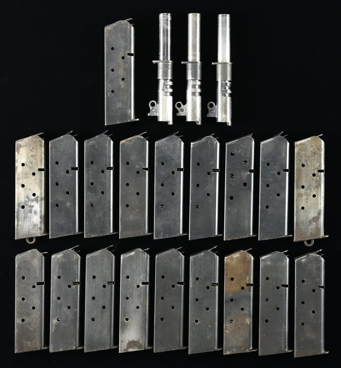 This lot consists of 19 7-rd 1911 mags, three 5" bbls. & three bbl. bushings. Eight of the mags are blued & marked "COLT/.45 AUTO" on the baseplate. One two-tone mag is marked w/ a stylized "COLT/45 AUTO" on the baseplate. Two mags have lanyard rings at bottom w/ worn finish. One mag is blued & is of Checkmate mfg. w/ proper government cage codes. Three mags are blued & of Scovil mfg. Two mags are blued & are of Risdon mfg. The last mag is blued & is of M.S. Little mfg. One bbl. is of High Standard mfg. The other two are marked "COLT .45 AUTO" on top of breech. The three barrel bushings are unmarked & have a dark parkerized finish. CONDITION: parts show varying degrees of finish wear & some oxidation. Bores of bbls. range from good to very good w/ some light pitting & frosting but strong rifling. (02-19822-2/MJC). $400-600.