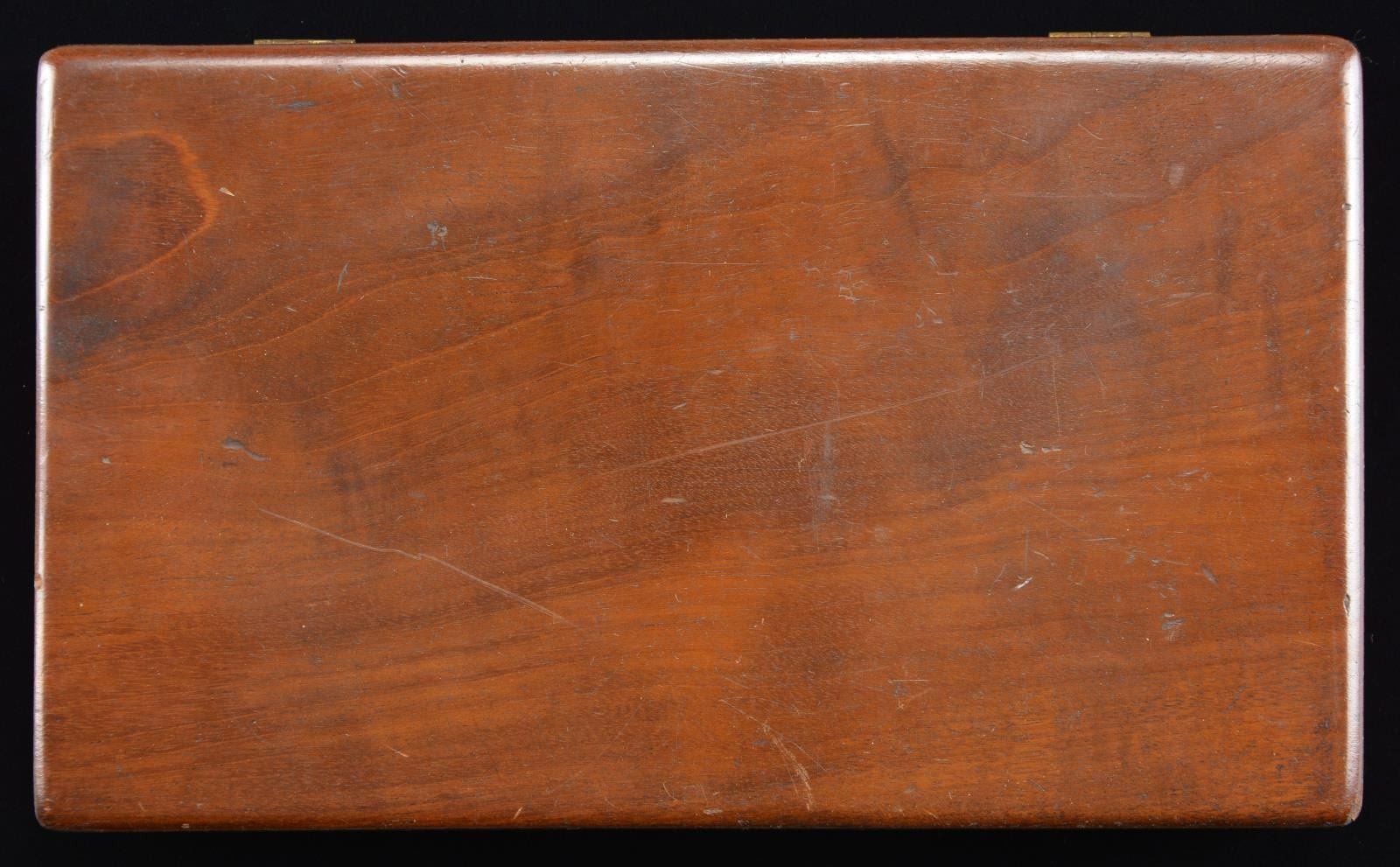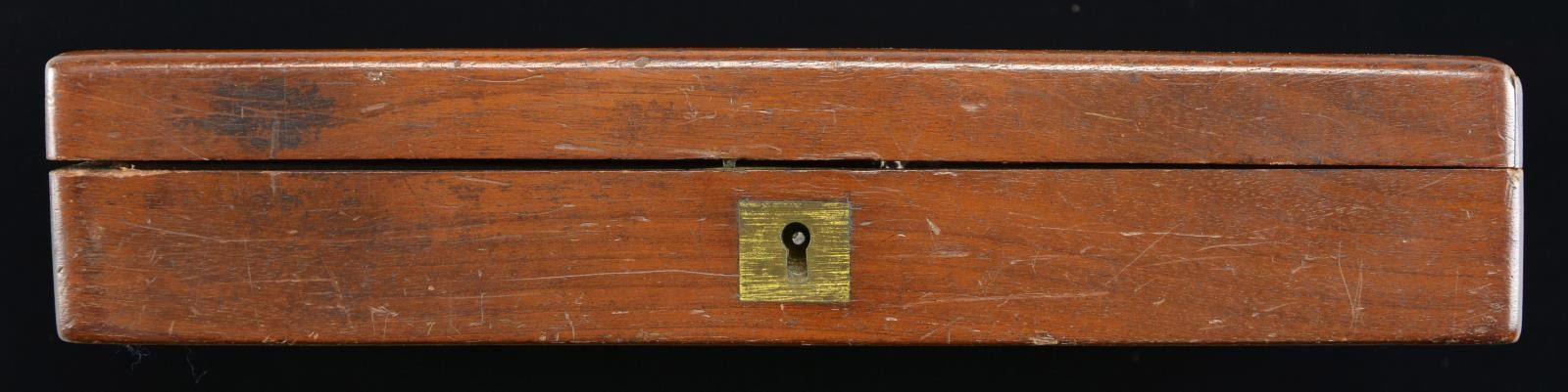 REVOLVERS. 9.75" X 6" X 2" walnut display case w/ partitioned interior appearing to fit 4" barrel pocket model revolver. Case contains 2 lead balls, loading rod, key & Eley Bros cap tin w/ modern appearing caps. CONDITION: Case has good intact appearance showing scratches & marks commensurate w/ age. Interior felt shows age related fading of color, wear & tear in contact areas (muzzle areas predominantly). (02-19292/MD). $700-900.