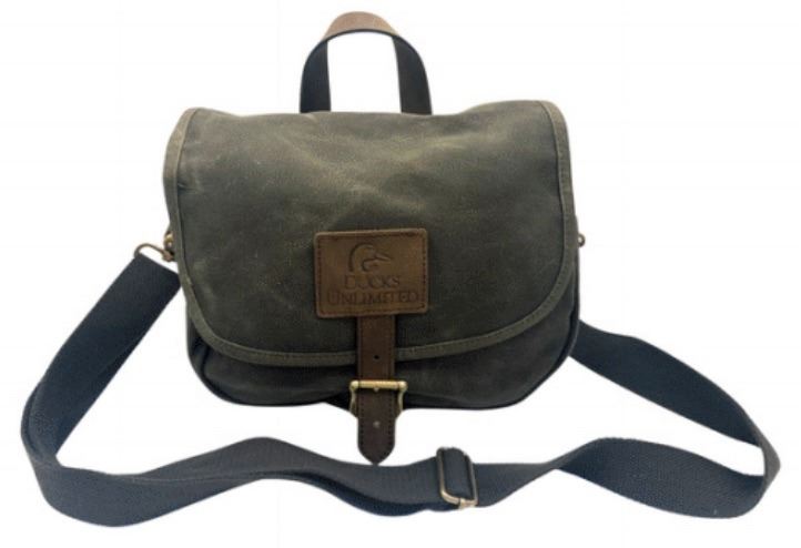 DU/Chene Co-branded Field Bag, 100% cotton waxed canvas, bullhide leather trim, canvas twill lining, heavy-duty antique brass hooks and closures, cotton webbing shoulder strap with antique brass adjuster