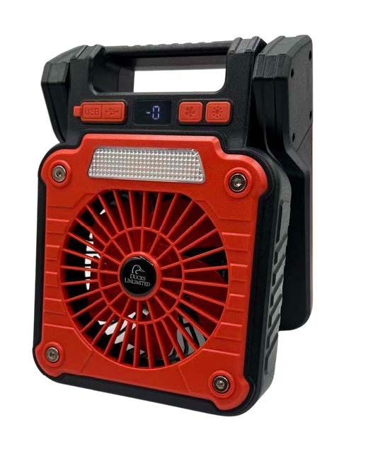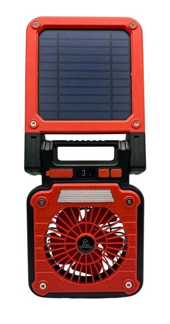 Full y rechargeable solar fan with light. Option to charge with USB-C cord or solar power. Features 3 fan blade modes, and five light options. Folds for standing or opens flat to hang.