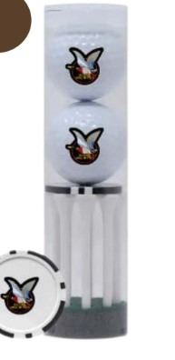 Golf ball set with Vintage DU Logo. Includes two Taylor Made Distance Plus golf balls, eight 2.75" golf tees and a poker chip ball marker. Packaged in a plastic tube