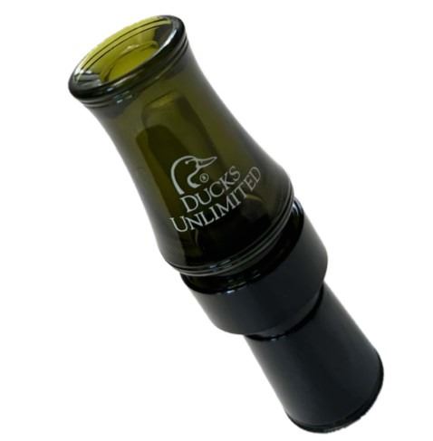 Double reed duck call by Buck Gardner. Features a silver DU logo. Olive green barrel with black insert and black metal band