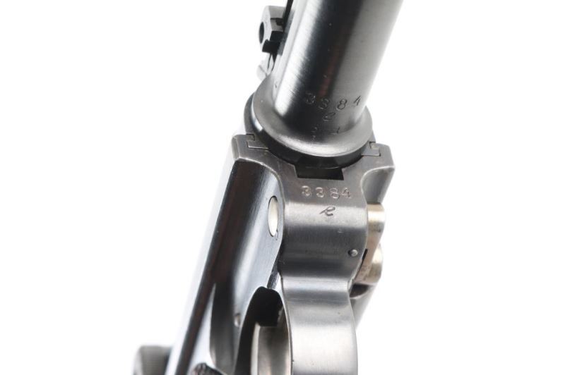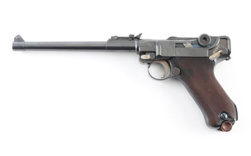 Pistol. Semi-Automatic. 8 rd Magazine. Toggle-locked, short recoil. WW 1 issued Military sidearm. 8" barrel. Inverted V front sight and tangent rear sight, 100 to 800 meters."DWM" Monogram on toggle. 1917 dated. Serial numbers matched on all parts, crown letter proofs, and Imperial eagle firing proofs on right frame and barrel. "Gesichert" marked safety. Small "8,82" stamped under the serial number on the underside on the barrel. Blued finish has dulled somewhat, but is about 96% with some minor scratches/edge wear. There is a little friction loss on the rear of the toggle. Markings are crisp/clear. Straw is about 60% with handling loss to the trigger, and levers. Nitre blue on springs and screws are bright/sharp .Bore appears very good/bright. Checkered wood grips are very good. Wood bottom of magazine is stamped "94" with Crown proof. NRA Condition-Very Good C&R Firearm.