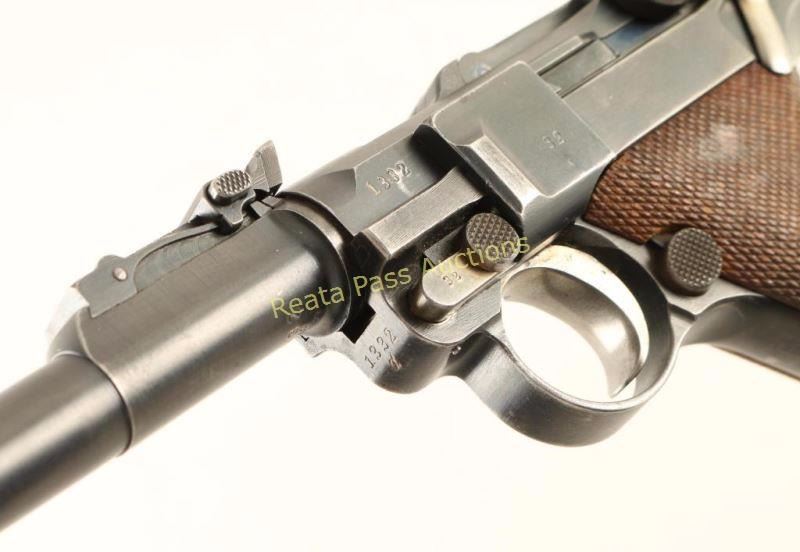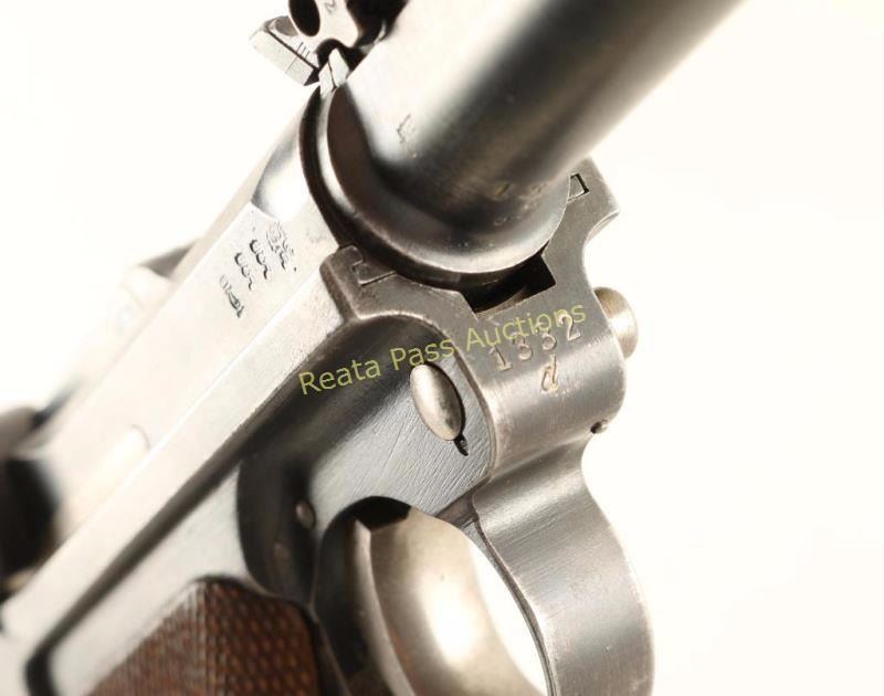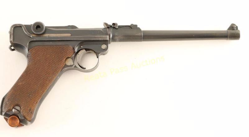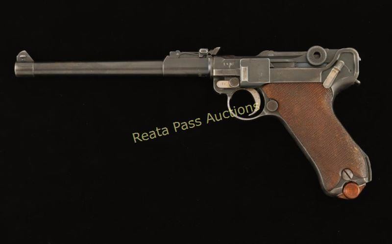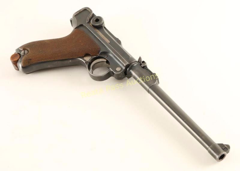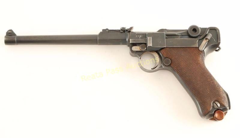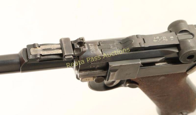 WWI German military contacted semi-automatic pistol chambered in 9mm Parabellum, dated 1917. Features a blued finish, 8" barrel, dovetailed inverted 'V' front sight, graduated rear sight to 800 meters, push button magazine release, 8 round magazine with wood base(non-matching), crescent trigger, manual safety, lanyard loop, and two-piece finely checkered walnut grips. All serial numbers match with the exception of the magazine. Pistol retains approximately 70% of it's original blued finish showing holster wear, small areas of very light pin prick pitting on the barrel and some finish loss on the grip frame & on the top of the receiver forward of the breech. The small straw colored parts also retain approximately 60% finish overall. Action is crisp, the bore is very good and wood grips are very good+ with minor blemishes & are worn semi-smooth. Condition is very good. ***C&R Firearm*** ***Modern Firearm***