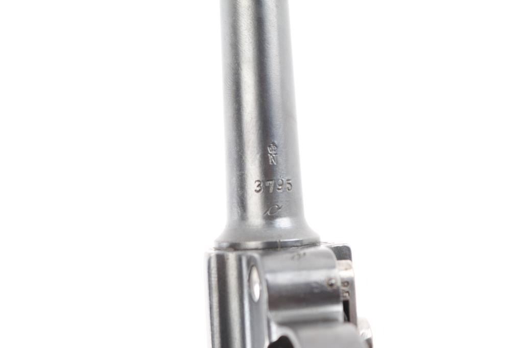 Undated German toggle locked recoil operated semi-automatic pistol chambered in 7.65 (30 Luger), manufactured between World Wars. No import marks observed. Features re-blued finish, 4" barrel, dovetailed inverted 'V' front sight with witness-marks, 'v' notched rear sight, smooth crescent trigger, knurled charging knobs on the rear toggle link, manual safety on the left side of the frame, knurled push button magazine release, steel frame with lanyard stable & stock lug, and two-piece finely checkered wood grips. Serial number matched on barrel, frame & toggle link. Sideplate, & take-down lever numbers scrubbed. Bore is good or better condition with crisp rifling, visible light pitting. Retains 90% finish with edge losses & handling marks. Straw finish parts are now blued, with exception of trigger & take-down latch which are bright bare metal. Grips are very good. Markings include crown over "N". Included magazine is nickeled body, wood plug, unmarked. Condition is NRA Very Good as refinished *** C&R Firearm ***
