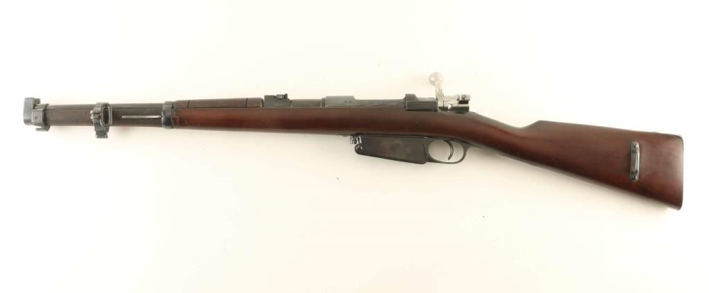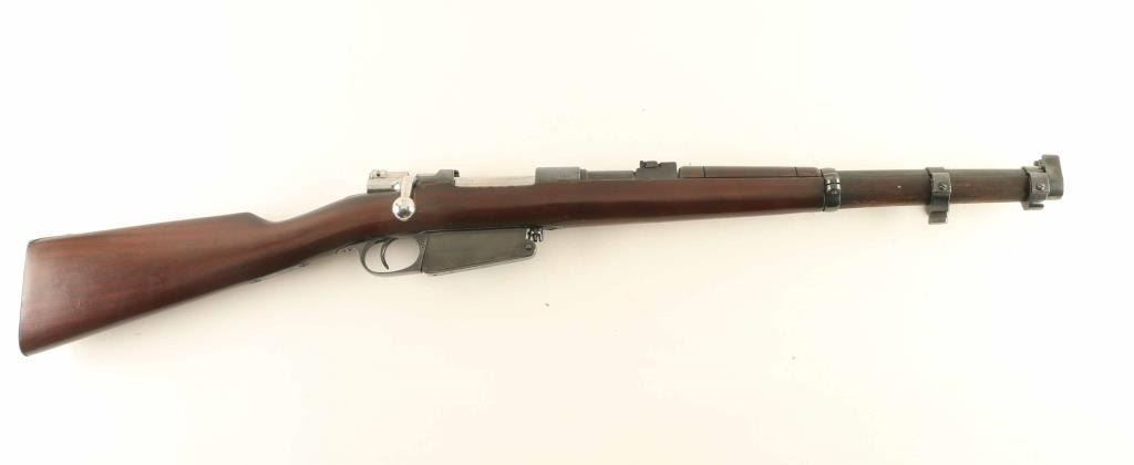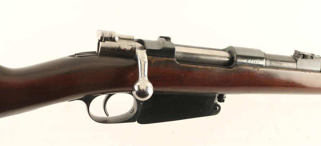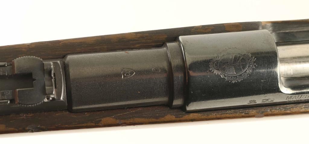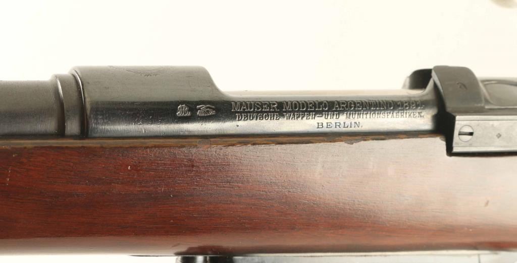 German made military bolt action rifle, originally made under contract for the government of Argentina. Features blued finish, wood stock with straight grip, 17.5" barrel, blade front sight with protector ears, flip-up ladder type rear sight, side mounted sling swivels, bayonet lug, manual safety. Bore is very good condition. Appears re-blued, with 95% coverage of glossy dark color, except bolt assembly which appears chrome or nickel plated. Wood is very good condition with few dents or scratches, buttplate extends slightly past wood at edges. Argentine crest on receiver ring. Bolt & magazine numbered to rifle, bands have mismatched numbers. Condition is NRA Very Good as refinished *** C&R Firearm ***