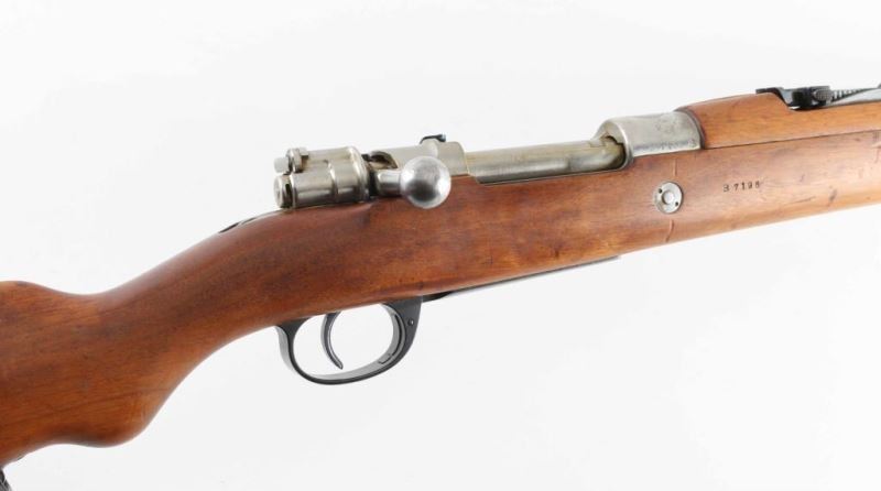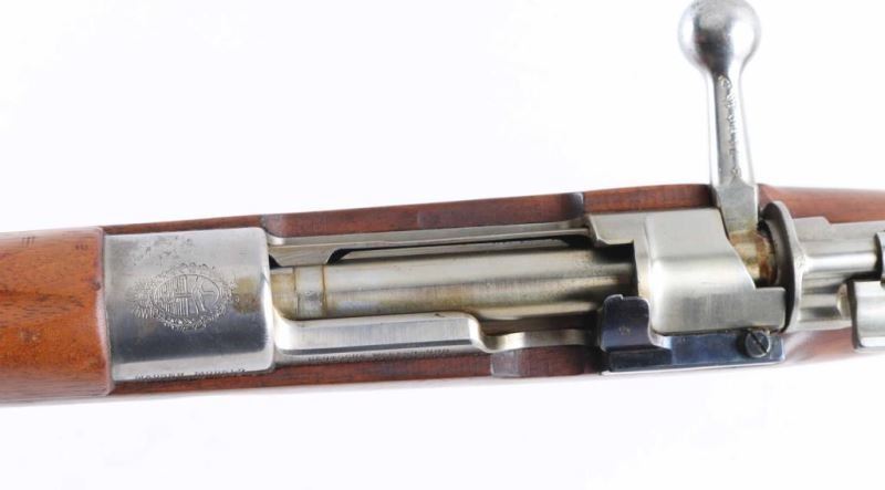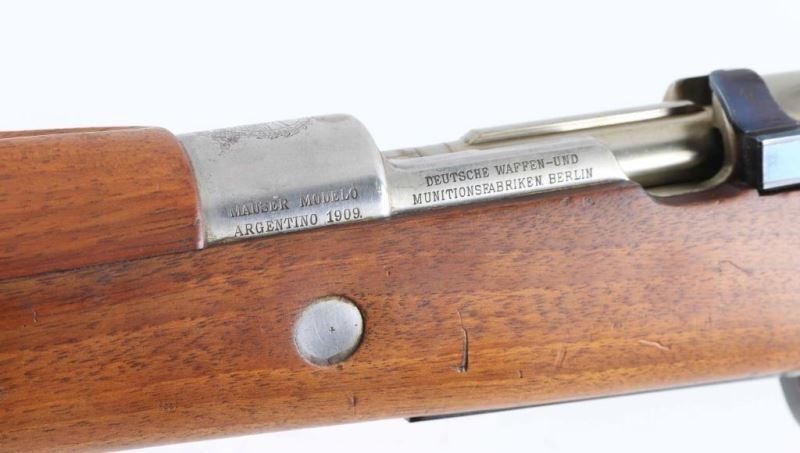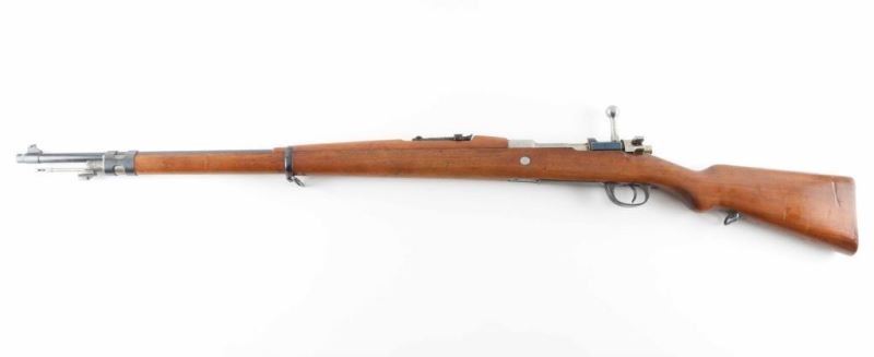 Manufactured in Germany for the Argentinean government, no importer marks observed. Military bolt action rifle, features approx 29" barrel, straight bolt handle, blade front & tangent rear sights, sling swivels, bayonet lug with "Ricchieri Adapter" to allow mounting of the M91 style bayonet, hinged floorplate, cleaning rod under barrel, wood shoulder stock with semi-pistol grip, wood handguard. Metal parts are mostly blued, with bare polished metal receiver, bolt assembly & band springs. Bore is in good to very good condition, slightly dark with frosting, showing strong rifling. Retains 90% blued finish with scratches and edge wear, bare metal spot near muzzle. Polished parts are good to very good condition. Wood is in very good condition with minor scratches and scrapes. Argentinean crest on receiver. Serial number repeated on bolt, triggerguard & stock. Condition is NRA Very Good++ *** C&R Firearm ***