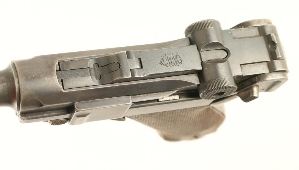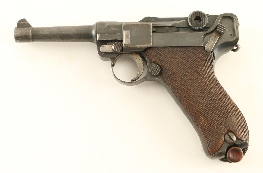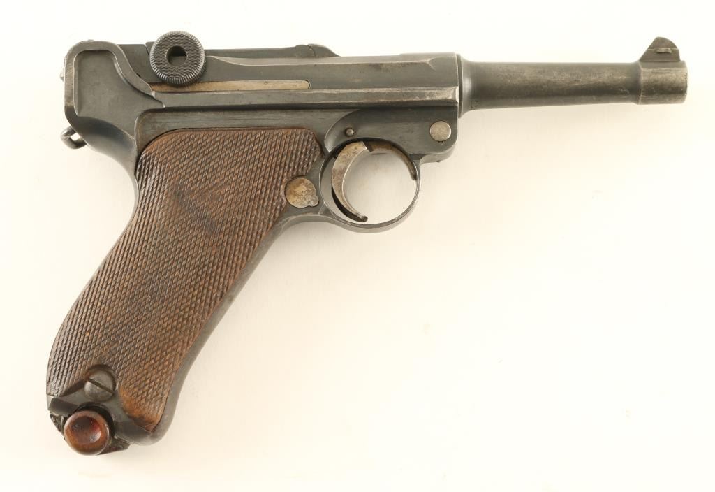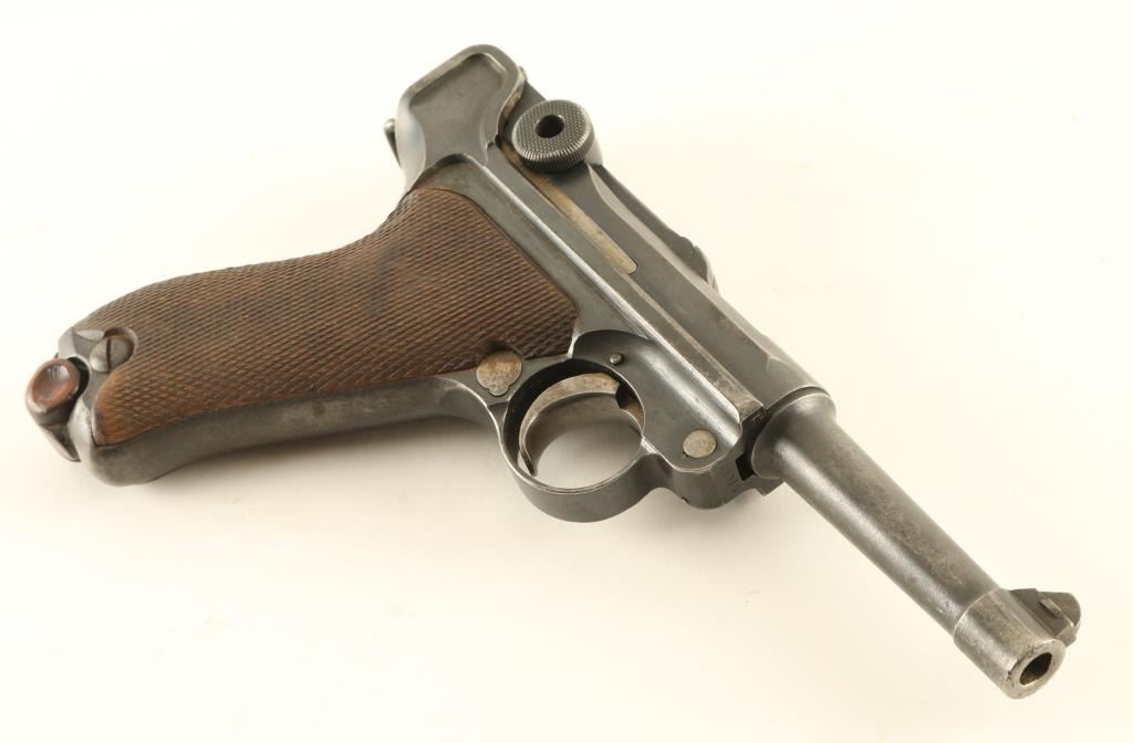 German semiautomatic pistol features blued finish, checkered wood grips, 4" barrel, fixed sights, single action trigger, frame mounted manual safety, push button magazine release. Bore is fair condition, sharp edges visible on rifling lands, dark with visible pitting. Retains 75% coverage of bluing, with bare metal on edges and high surfaces. Takedown lever body has multiple deep scratches. THhe stock lug has been ground off the backstrap. Grips are fair to good, serviceable, with many small dents and gouges. No import marks observed. Includes one nickel bodied magazine with wood base; nickel finish is moderately corroded resulting in a mottled brown color.