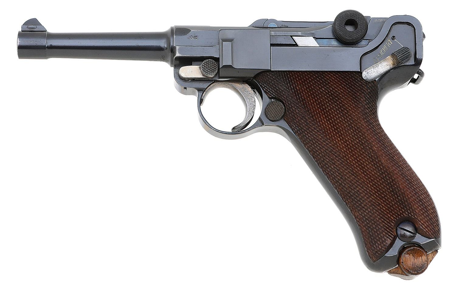 serial #57156, 9mm, 4'' barrel with a bright very good plus bore with some light oxidation but strong rifling throughout. The metal surfaces retain about 95% original blue with light wear on high edges, areas of light thinning toning to gray-brown under bright light, and scattered fine freckling and minor handling marks. The strawed parts have largely toned to a silvery-gray patina with remnants of color at the edges and some gray freckling, and the sear spring and toggle pins retain vibrant fire blue. The checkered walnut grips are in very good plus condition with general light wear, and the right panel numbered ''78'' with the left panel appearing unmarked. The DWM monogram on the toggle remains crisp, crisp ''(crown) / N'' proofs are stamped on the toggles, barrel, and receiver, and the numbered parts are matching to the pistol; the un-grooved firing pin is unnumbered. The pistol retains the standard open sights, no hold-open system is present, the takedown lever spring is loose allowing the lever to easily be removed, and included is a bright-bodied wood-base magazine showing light flaking on the body, the base numbered ''2248 / l / +''. A nicely preserved example of these more desirable commercial 9mm pistols. (14B11728-892) {C&R} (1200/1800)