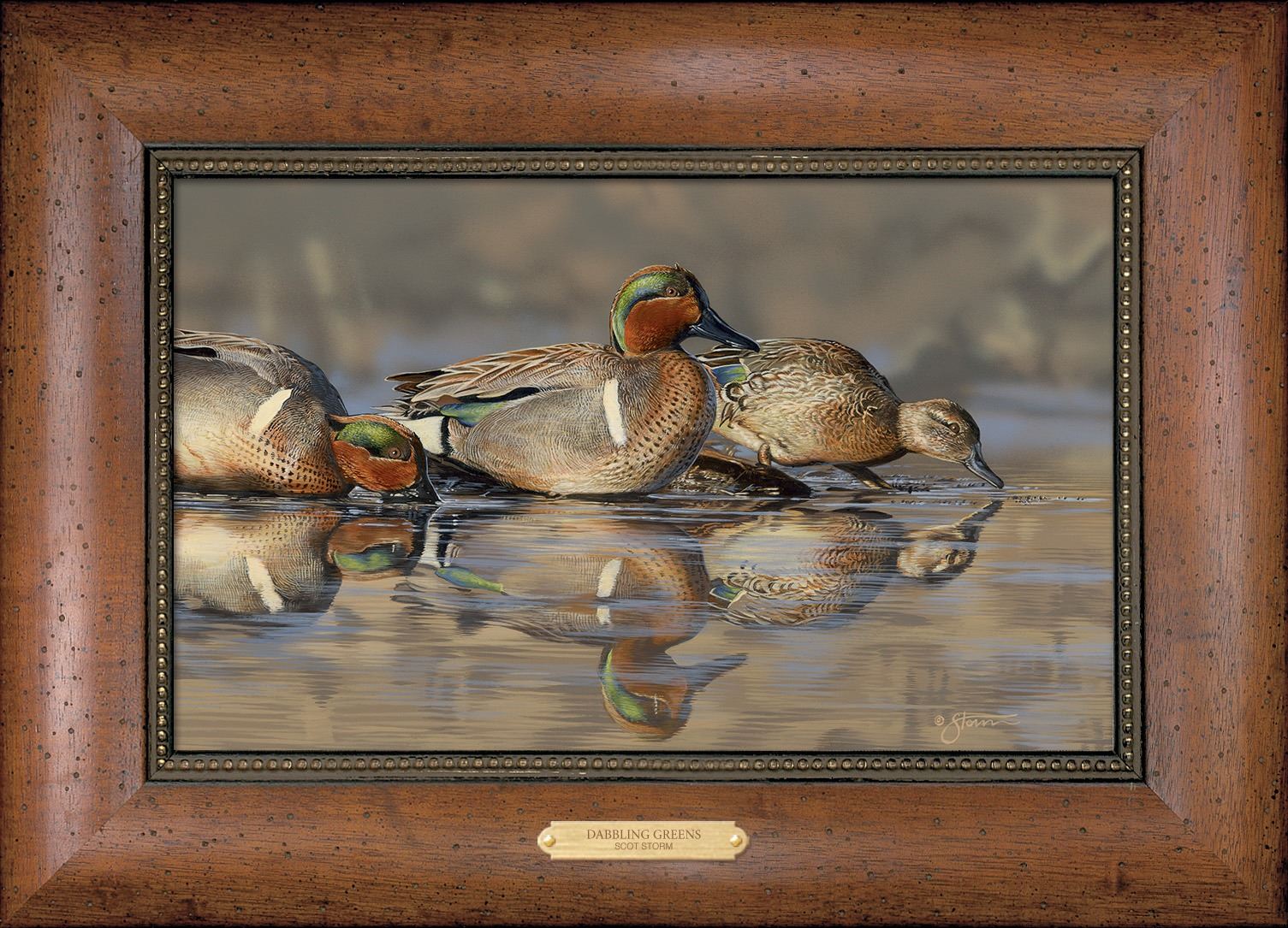 Image Size: 12½”x20½” Scot Storm is a talented, self-taught artist whose love of hunting and the outdoors continues to inspire him to paint wildlife. In Dabbling Greens, a lifelike depiction of green-winged teal reflects in serene water.