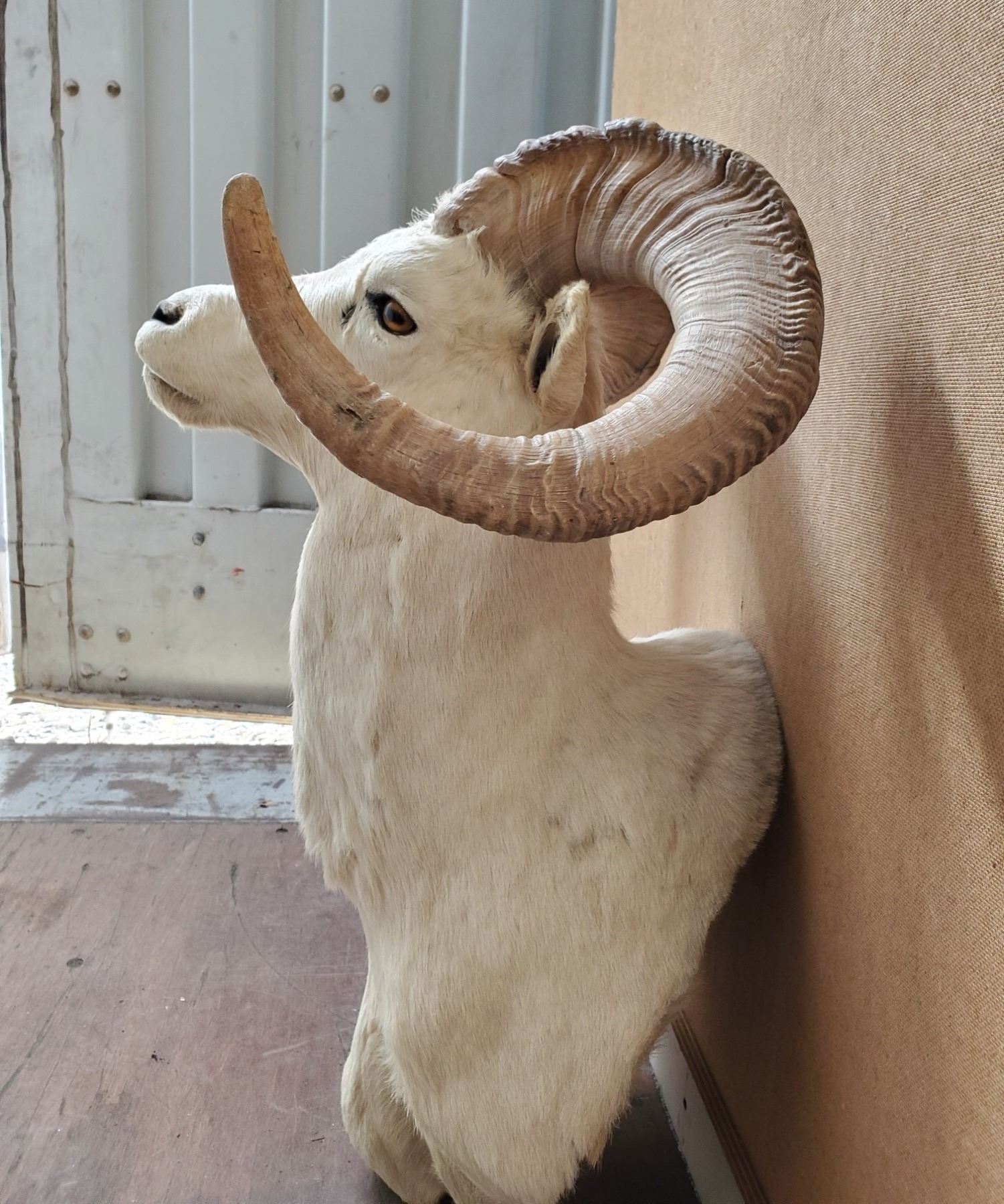 This Alaskan Dall Sheep is from the Bob Hall collection. Bob staged out of the famed Rainy Pass Lodge on this hunt, and took the sheep in the Alaska Range near Veleska Lake. For those who might not be familiar with Alaska, the Rainy Pass Lodge is Alaska’s oldest hunting lodge, founded in 1937. It is also a stop on the Iditarod Race each winter. In fact, the Lodge is an official check point on the “Last Great Race on Earth”. This is a nice quality shoulder mount and you can judge the horns for yourself in the pictures.