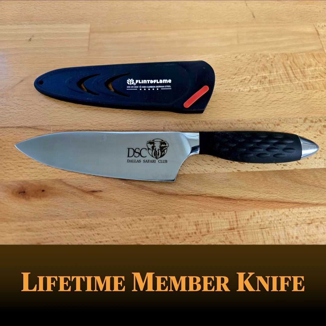 Become a Life Member of Dallas Safari Club and support their mission to ensure the conservation of wildlife through public engagement, education and advocacy for well-regulated hunting and sustainable use. Life Members receive a gold Life Member lapel pin, Kryptek Life Member vest, an invitation to the annual Life Member Breakfast at the DSC convention, Game Trails magazine, monthly electronic newsletter, personalized membership certificate, and an assortment of DSC branded promotional items. Lifetime memberships purchased during the 2026 Heartland DSC Banquet will receive a Flint & Flame PRO series 6" Chef knife with blade protector, etched with the DSC logo.