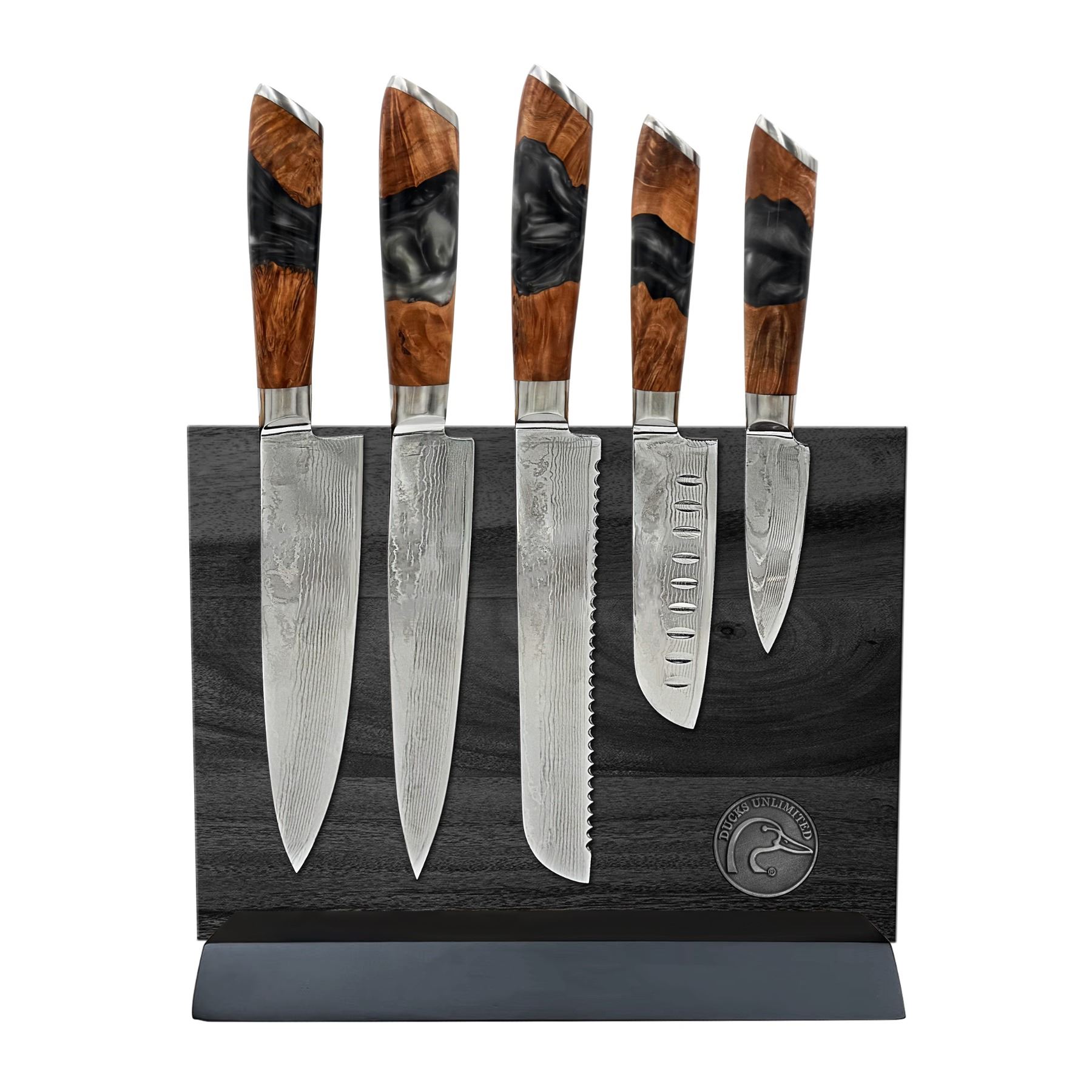 The premium 6-piece Damascus cutlery set masterfully blends ancient craftsmanship with modern technology.Each of the five distinct purpose blades is meticulously crafted from 67 layers of fine Damascus steel, ensuringexceptional sharpness and durability. These razor-sharp blades are complemented by exquisite handles madefrom a combination of resin and stabilized wood, each proudly displaying the Ducks Unlimited logo on the endcap. The set is elegantly displayed on a coordinated vertical standing, double-sided magnetic base, which notonly provides secure storage but also showcases the beauty of the knives. This cutlery set is a testament to bothtimeless artistry and contemporary precision, making it a standout addition to any kitchen.