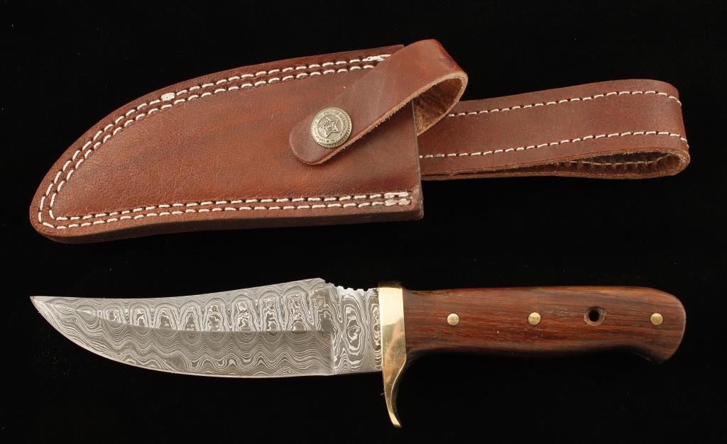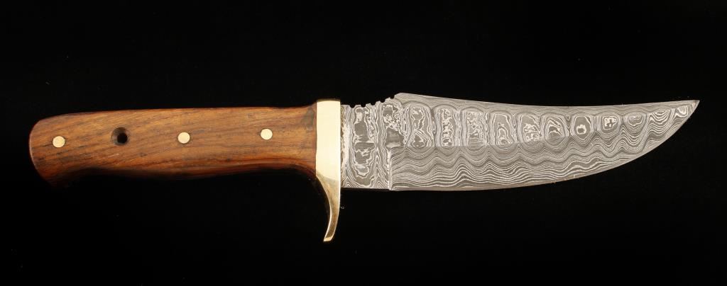 9" with a carved walnut wood and brass handle. Upswept is 5" and the handle is 4". Comes with handmade genuine leather sheath. Custom made by Kevin Johnson.