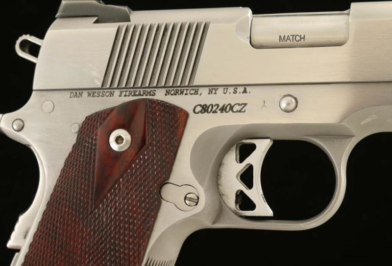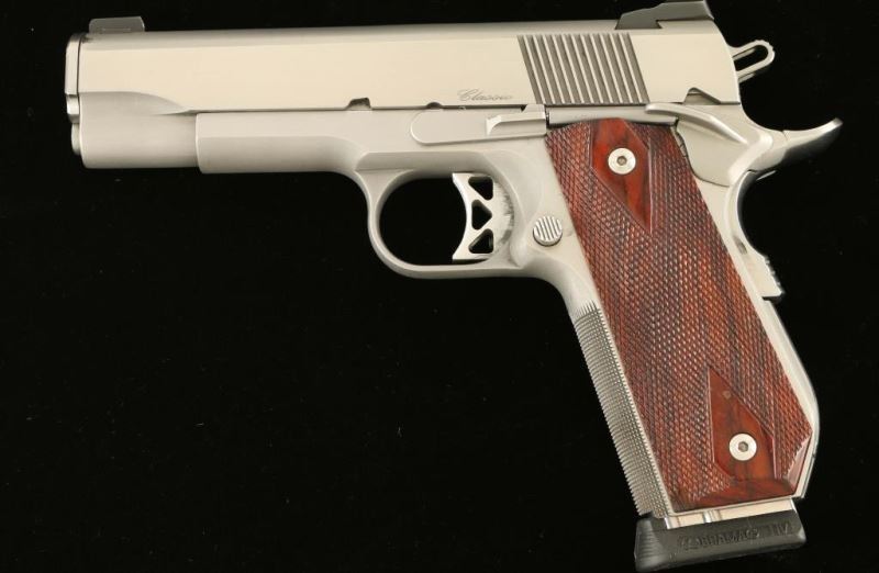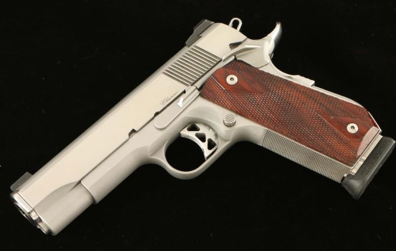 'Commander Classic Bobtail' Premium stainless steel 1911-A1 style semi-automatic pistol chambered in 10mm, circa 2008. Features a brushed/matte finish, 4.25" match grade barrel, full-length steel guide rod, Warren Tactical Tritium 2 Lamp sights, adjustable serrated trigger, skeletonized hammer, thumb safety, beavertail grip safety, steel frame with knurled front strap & bobbed backstrap, smooth mainspring housing, push button magazine release, 8 round Tipp Research System magazine, and double diamond checkered two-piece rosewood grips. Include the original factory hard case with spare magazine, spent case, tool and manual. Also includes a .40 Smith & Wesson match grade barrel w/ bushing, two .40 caliber magazines and five additional recoil spring with varying strengths. Pistol exhibits bright wear on the front of the slide, some light handling marks and heavier wear observed on the rear portion of the slide & frame on the right side. Action is strong, bore is pristine and wood grips are good with a chip missing from the top of the right panel. Condition is NRA very good+++. ***Modern Firearm***