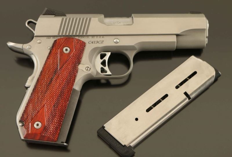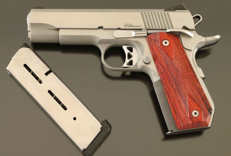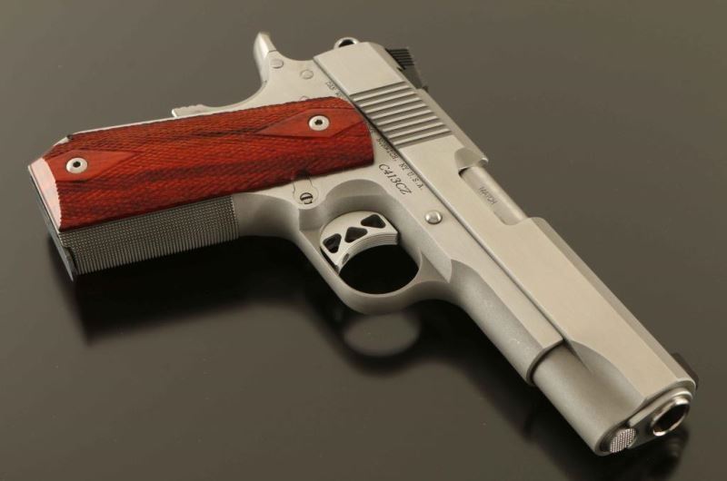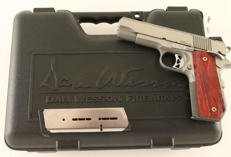 'Commander Classic Bobtail' Premium stainless steel 1911A1 style single action semi-automatic pistol chambered in .45 Auto. Features a brushed/matte finish, 4.25" match grade barrel, dovetailed low-profile three dot night sights, serrated adjustable trigger, skeletonized hammer with serrated spur, manual safety on the left side of the frame, extended beavertail grip safety, push button magazine release, 6 round magazine, knurled front strap, bobbed backstrap, smooth mainspring housing and two-piece double diamond checkered Cocobolo grips. Include the original factory hard case with manual, oil, take-down tool and Wilson Combat magazine. Pistol exhibits minor handling marks and slide wear on the barrel. Action is very smooth, the bore is pristine and wood grips are fine. Condition is NRA Excellent in case. ***Modern Firearm***