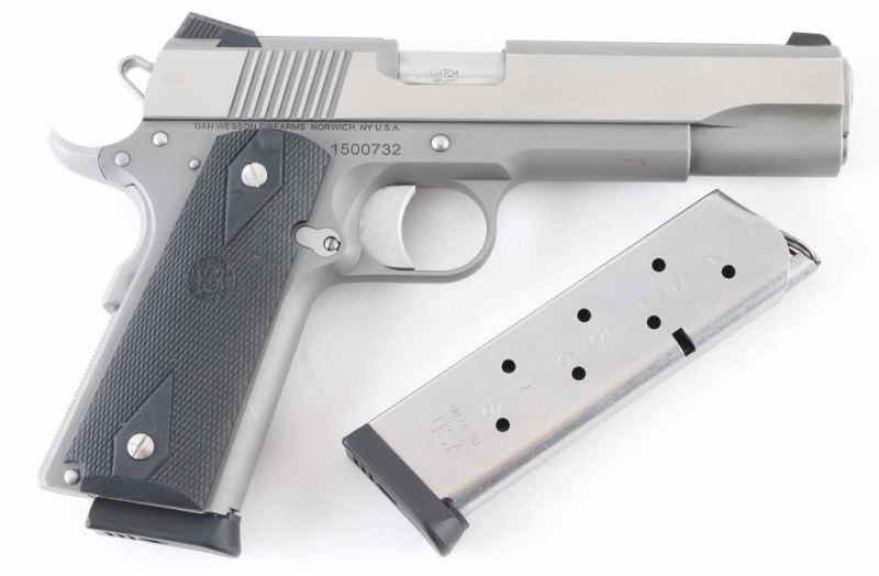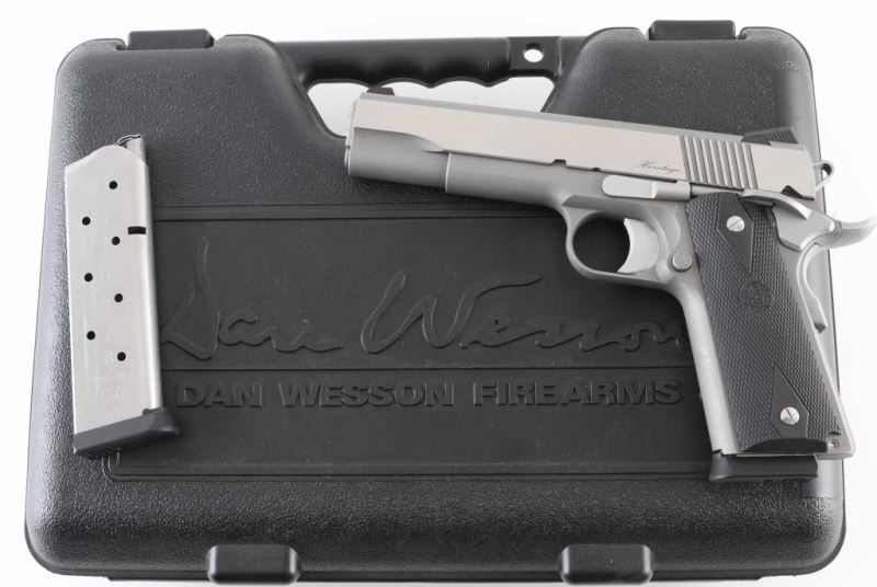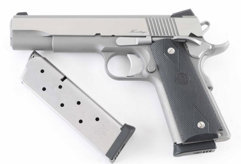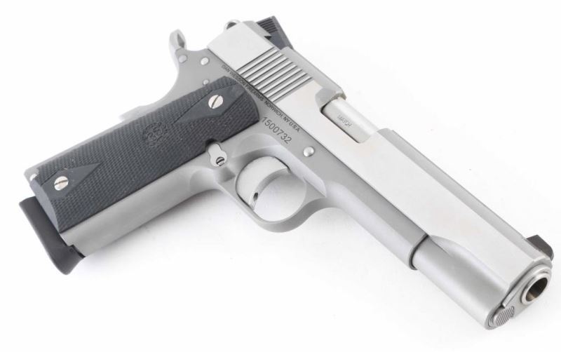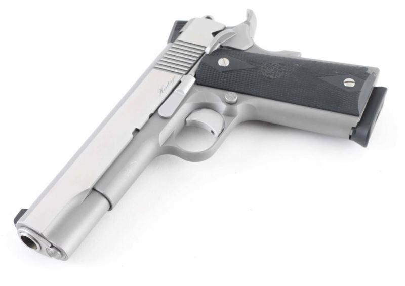 Semiautomatic pistol features stainless steel construction, single action, 5" barrel, dovetail mounted sights with night sight front & square notch rear, extended thumb safety, upswept beavertail grip safety with memory bump, serrated skeletonized hammer, Hogue checkered black rubber grips. Bore is very good condition. Overall condition is excellent with handling marks. Night sight insert retains it's glow. Includes factory plastic case, bushing wrench, manual, (2) magazines. Condition is NRA Excellent *** Modern Firearm ***