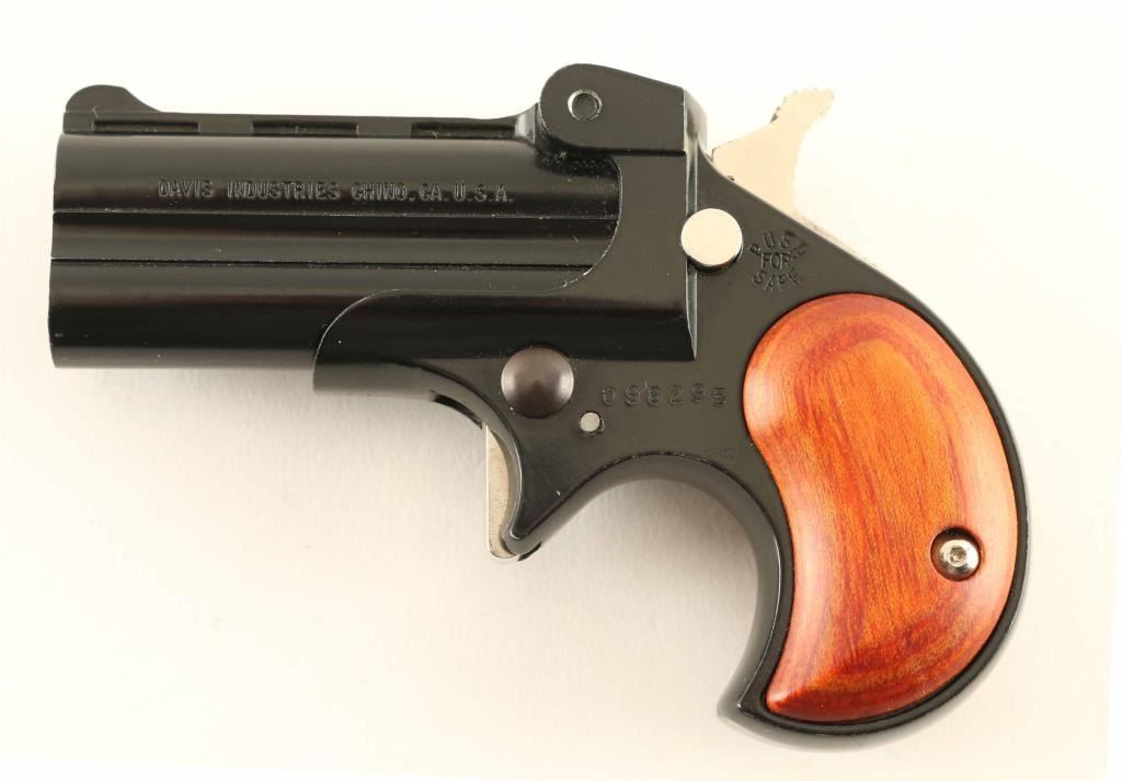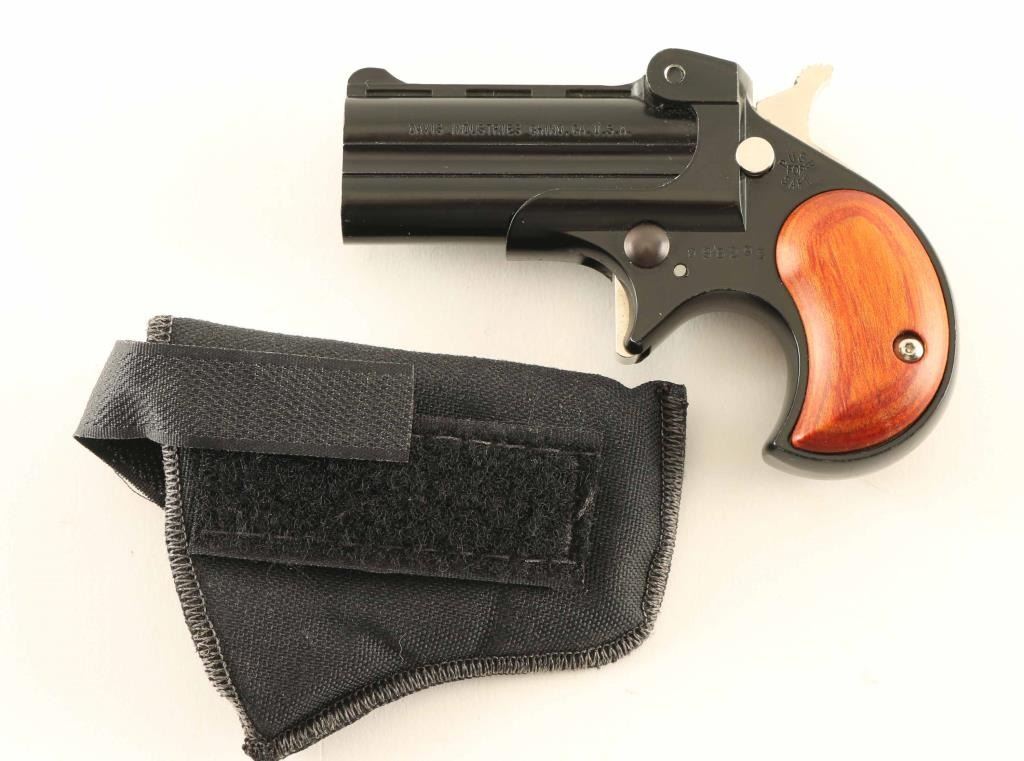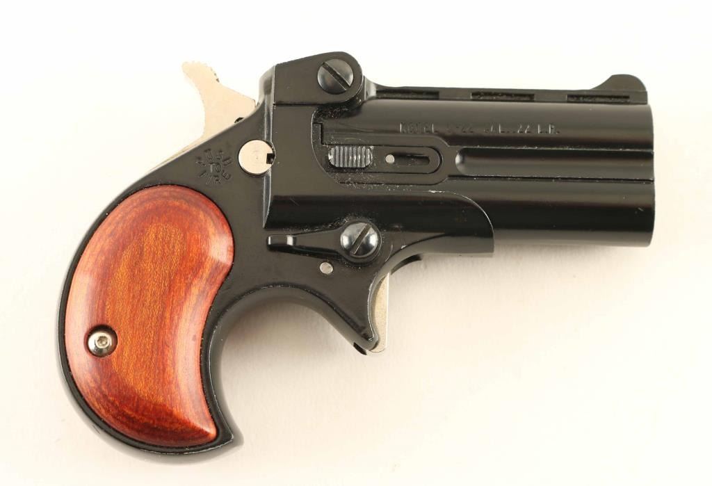 Deringer 22LR 2.4 inch double barrel over/under, Black Teflon finish, wood laminated grips, Push button safety, Wood and metal finishes are excellent, Comes with holster, Barrels are dirty but in fine condition, NRA Excellent Modern Firearm