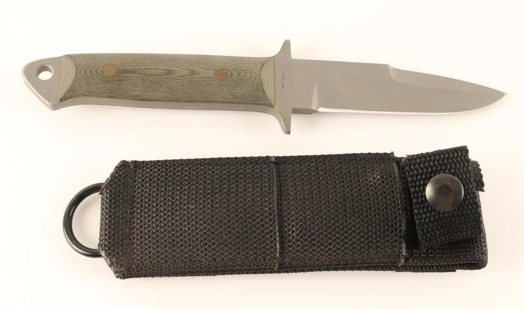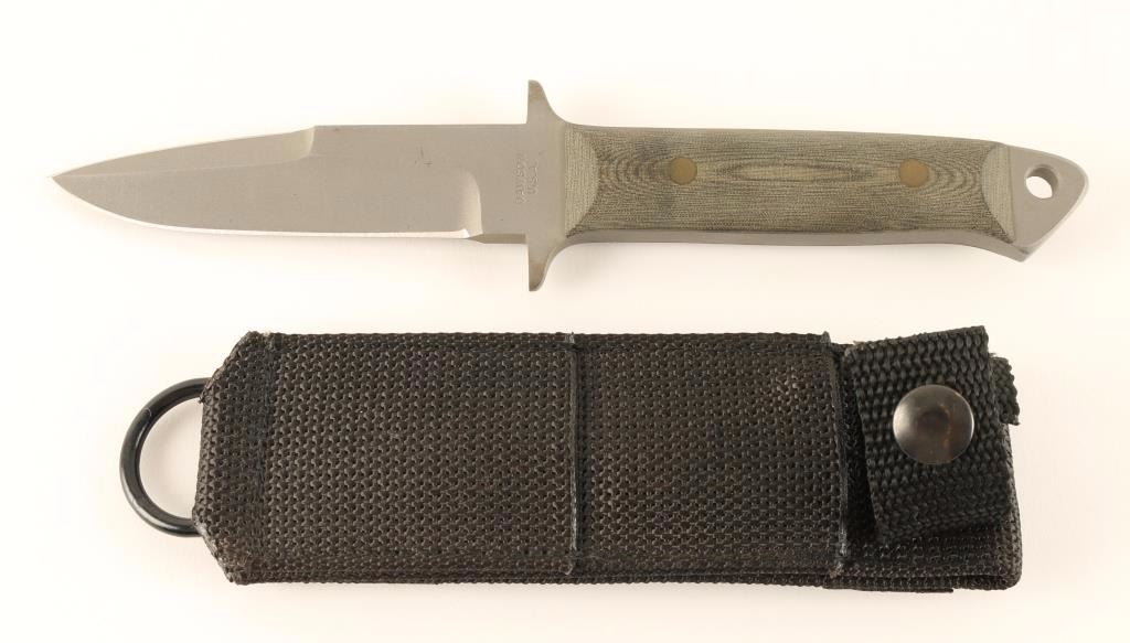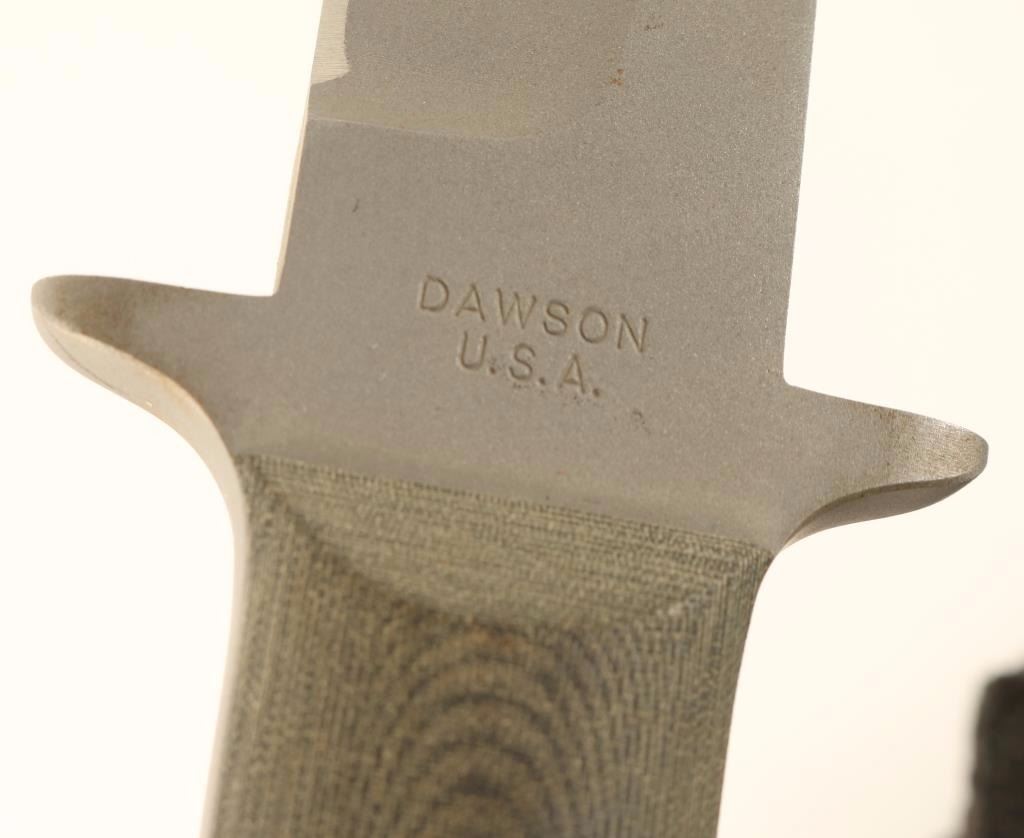 Green micarta wood grain handle with a gray coated stainless steel blade marked 'Dawson U.S.A.'. Measures 8 3/4" overall with a 4" blade. Comes in a black webbing sheath.