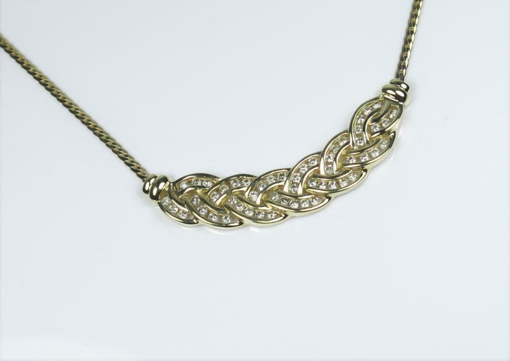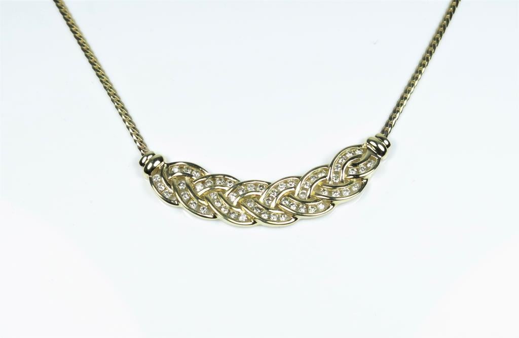 Dazzling Braided Design Diamond Necklace featuring 54 channel set ‘IDEAL’ Diamonds weighing 1.50 carats with H-I and VS/SI clarity set in a 14 karat yellow gold setting. Retail $3,000 - $4,000