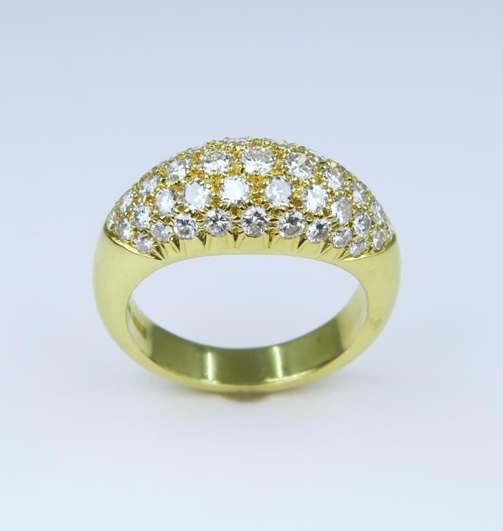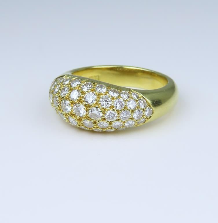 Dazzling Fine Cartier Style Diamond Ring featuring 50 Fine round pave set Diamonds weighing approx. 1.50 carats with F-G colors and VS clarity set in a meticulously crafted 18 karat yellow gold setting with a gold weight of 8.00 grams. Ring size 6 ¼. Retail $7,000-$9,000.