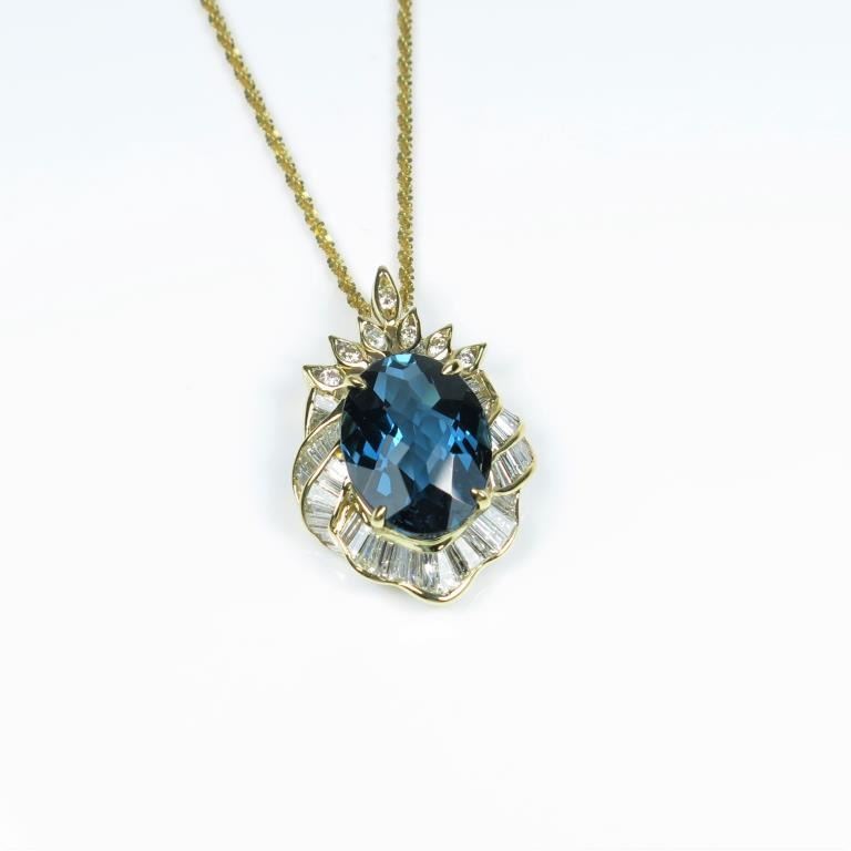Dazzling Fine London Blue Topaz and Diamond Pendant featuring an oval checkerboard cut Topaz weighing approx. 12.00 carats accented with 65 baguette and round channel set Diamonds weighing approx. 3.00 carats withG-H colors and VS/SI clarity set in 18 karat yellow gold. Retail $5,000-$6,000 Estimates $3,000-$4,000