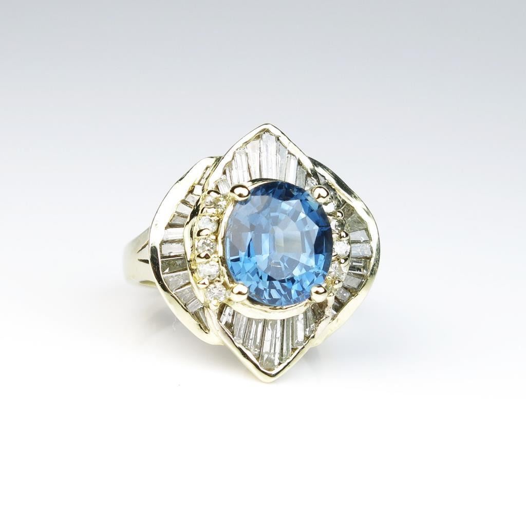 Dazzling ladies ballerina design ring featuring an oval blue sapphire weighing 4.63 carats and surrounded by round and tapered baguettes weighing over 2.00 carats of H-I colors and SI clarity set in a 14 karatyellow gold setting. Please see Full appraisal at $9,400.00 Estimates $4,000-$5,000 Nice
