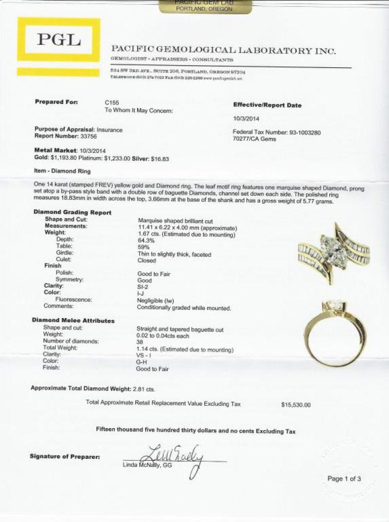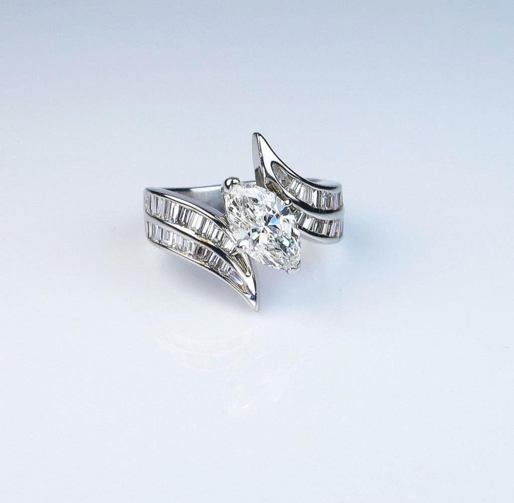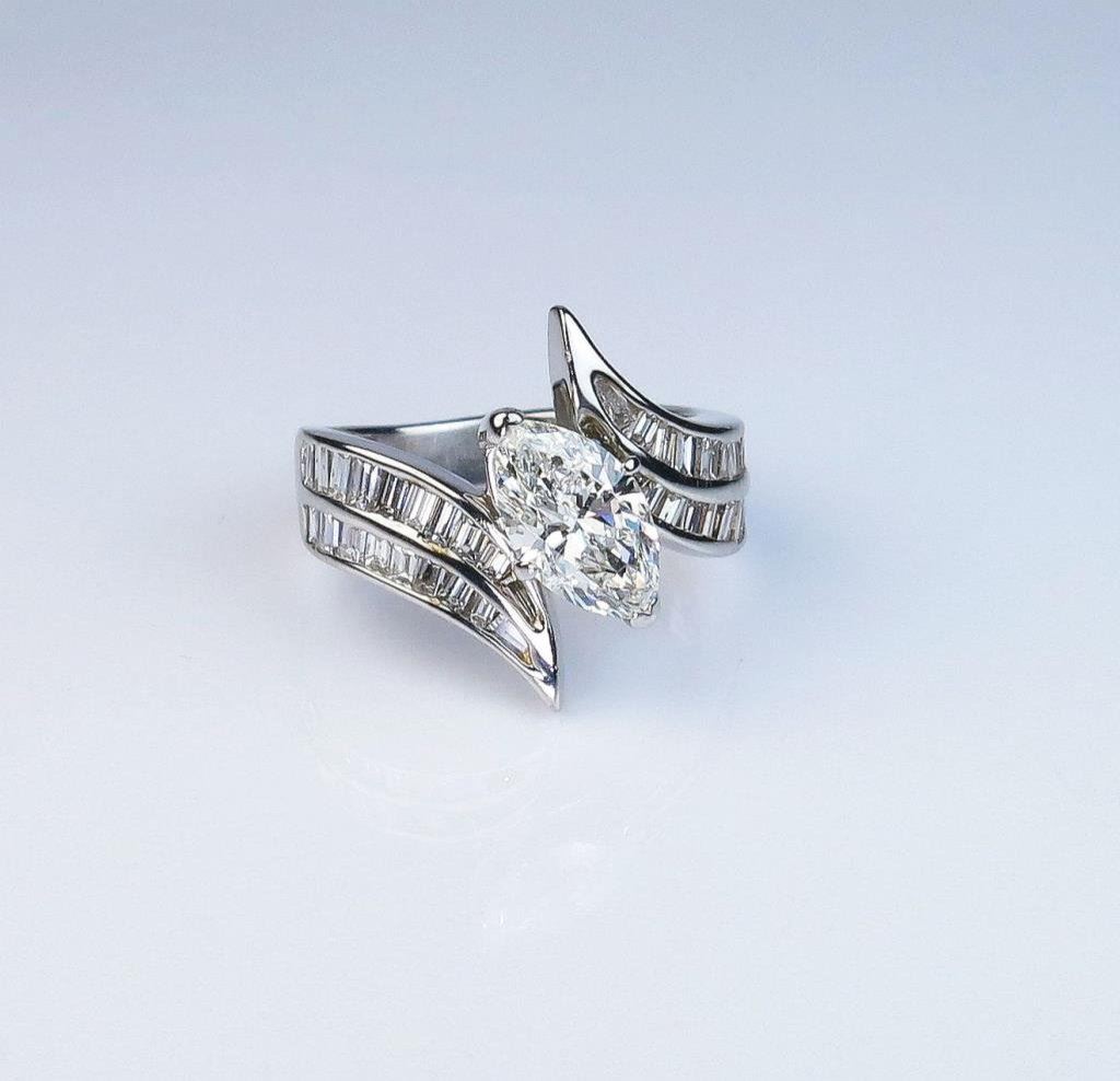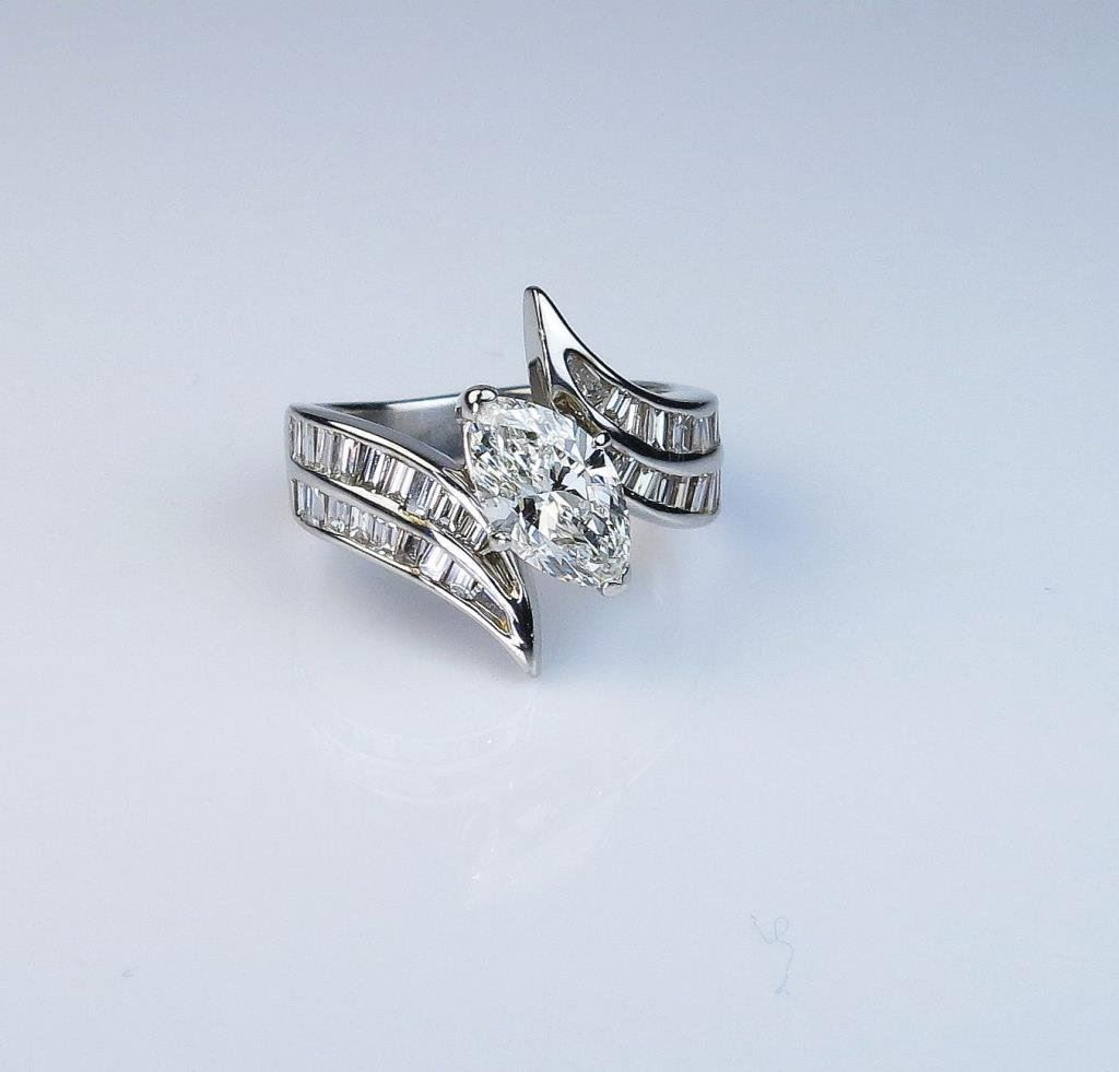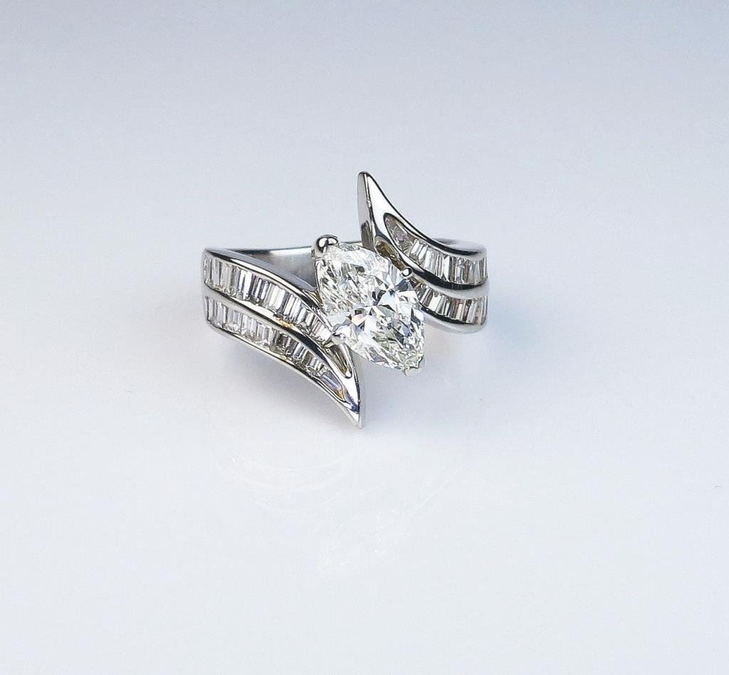 weighing 1.67 carats of H-I color and SI/I clarity and channel set with 38 baguette cut diamonds weighing approx. 1.14 carats of G-H colors and VS/SI clarity set in a 14 karat white gold custom made setting. Please see Full Appraisal. Retail $15,000-$20,000 Estimates $8,000-$12,000 Featured item