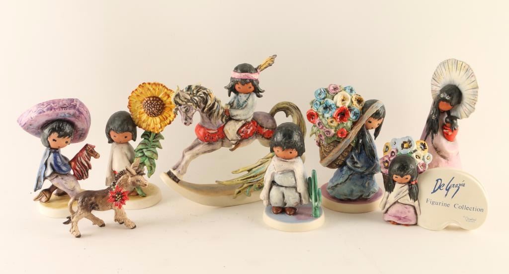 All by Goebel made in Germany. Including; 'De Grazia Figurine Collection' advertiser girl with flowers in a basket advertiser, boy on rocking horse, boy in sombrero on stick horse, boy with large sunflower, Madonna and child, boy with cactus, girl carrying basket of flowers on her back, and a small donkey with a poinsettia.