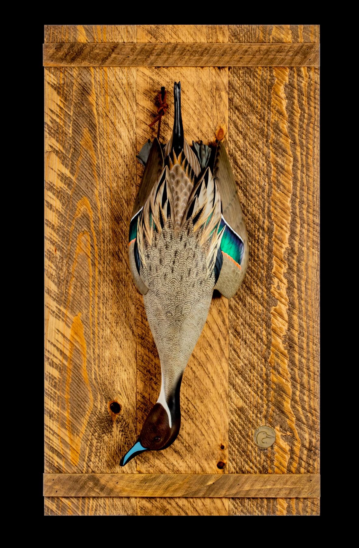 The trophy drake pintail is slightly larger than life size. This was carved by 5-time World Champion carver, Randy Tull. It is mounted on an 18”x32” manufactured barnwood display. It is including hardware for hanging and a DU medallion.