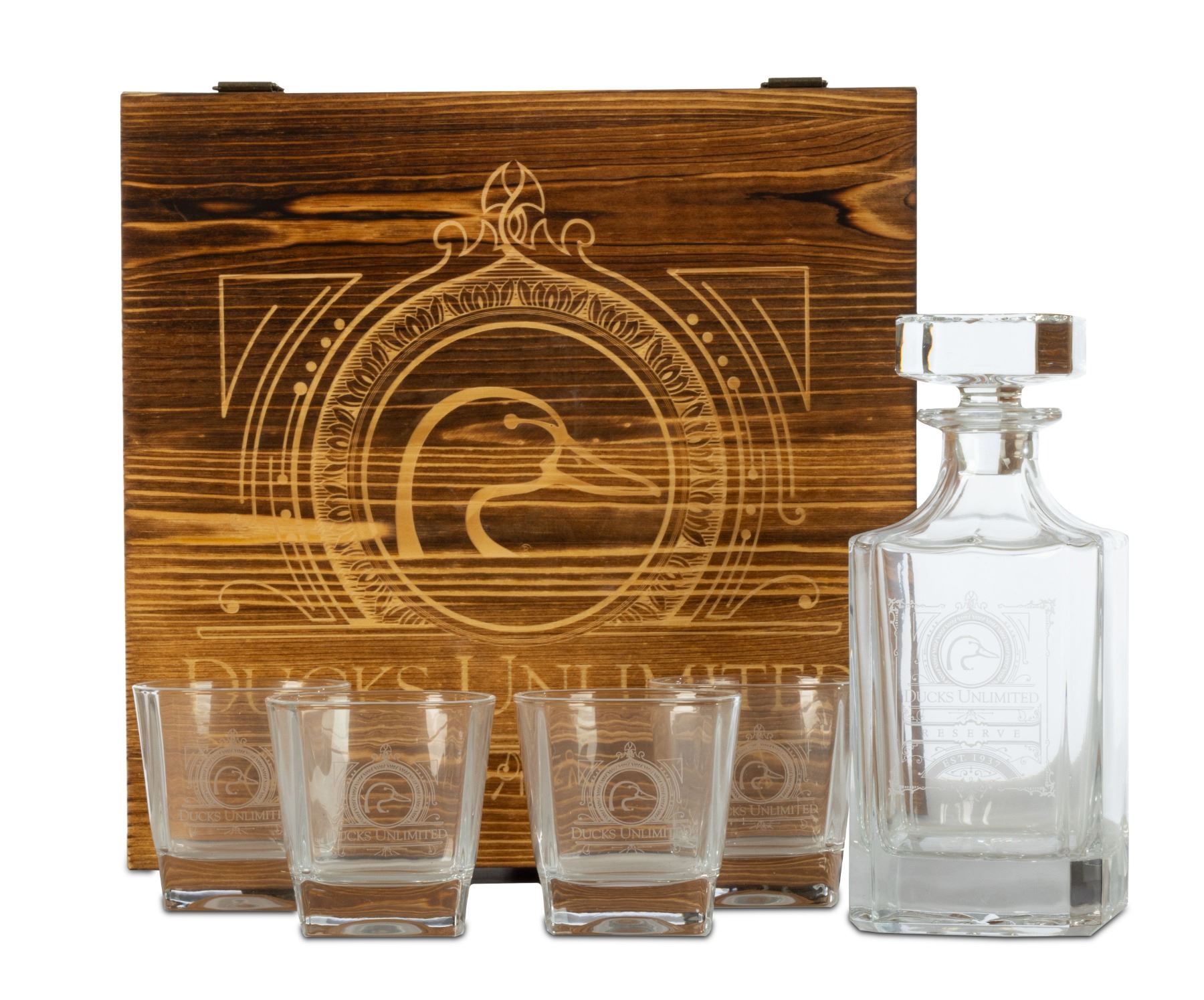 The Decanter Set offers a custom and exclusive experience, featuring the distinctive "Ducks Unlimited Reserve" design. This set includes a finely crafted decanter with an elegant stopper, along with four highball glasses. The allure of the set is elevated by its presentation in a custom wooden box, expertly etched with the Ducks Unlimited logos. This decanter set is a testament to the fusion of artistry and functionality, offering both a luxurious display piece and a functional addition to your collection. With its attention to detail and craftsmanship, this set embodies the Ducks Unlimited ethos and is a fitting tribute to the appreciation of fine spirits and the preservation of nature.