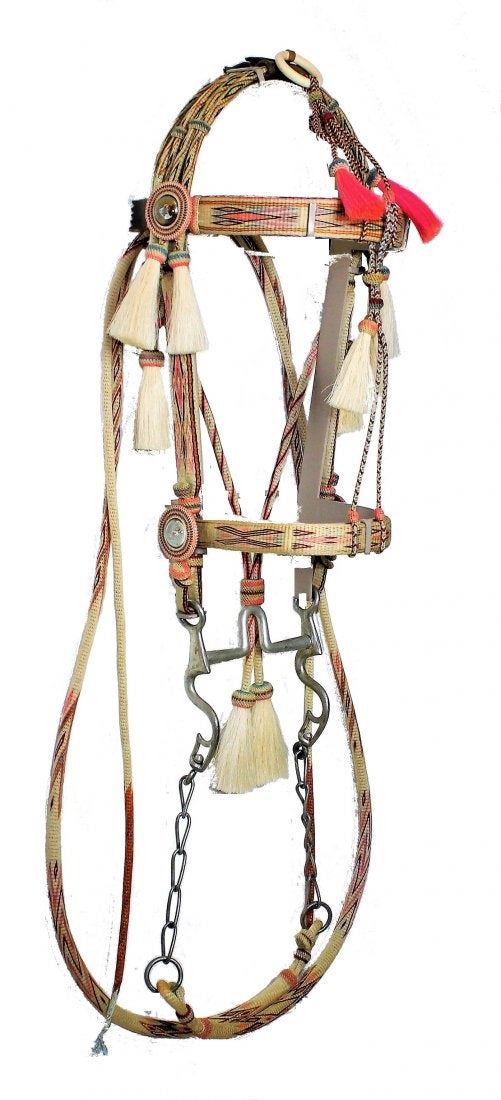Incredible 9 color prison made horsehair bridle with crisp geometric design throughout, hitched rosettes and split reins. In fantastic condition, with custom made walled display mount.