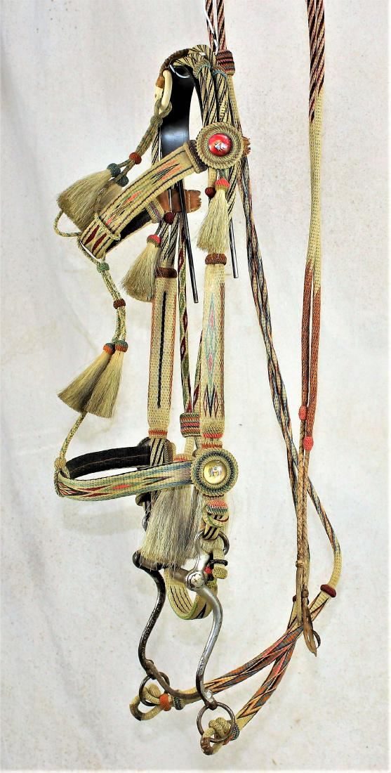 Extra nice nine colored bridle with hitched rosettes, with uncommon turqouse geometric design on white background, retaining its original curb strap and split reins with great braided leather ends.