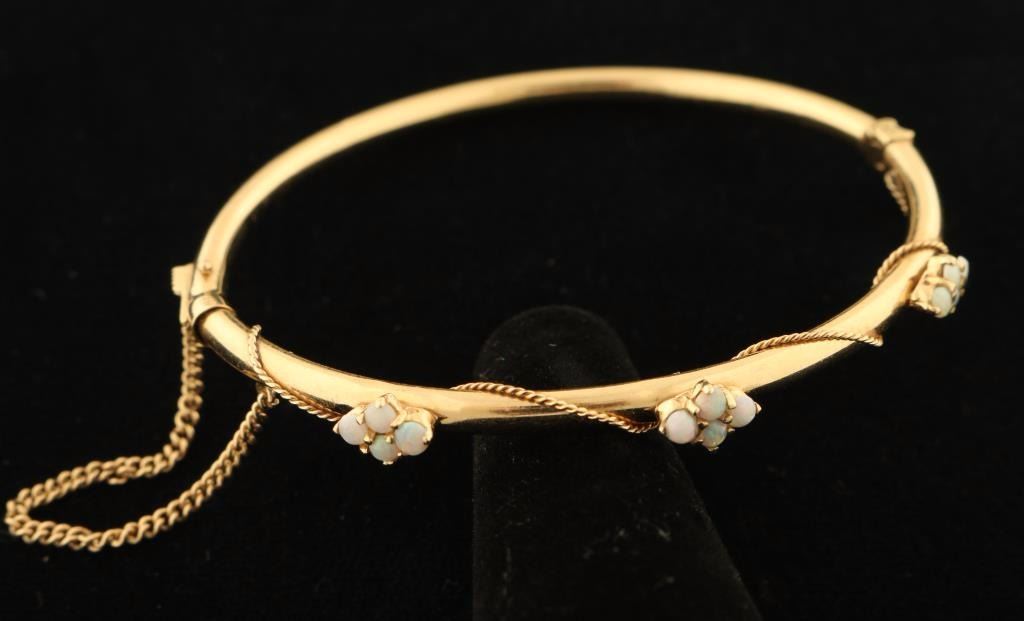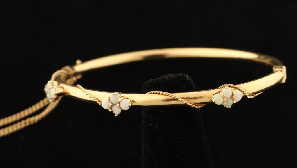 Three floral motif opal settings in 14K yellow gold with a very fine rope curling between the stones. Clasp closure with a safety chain.