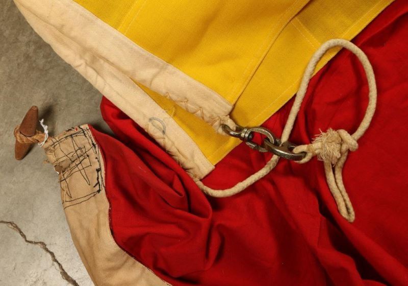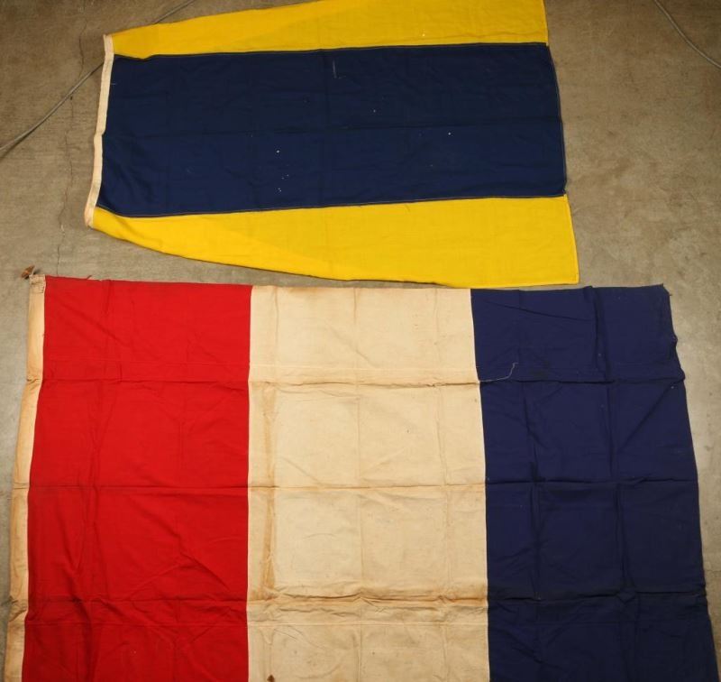 Blue and yellow striped flag Cotton/ canvas material which has a single tear. Maritime flag signals "Keep clear of me; I am maneuvering with difficulty."Red, White and Blue Flag Horizontal striped flag cotton material signals Tango "Keep clear of me." good condition shows age.