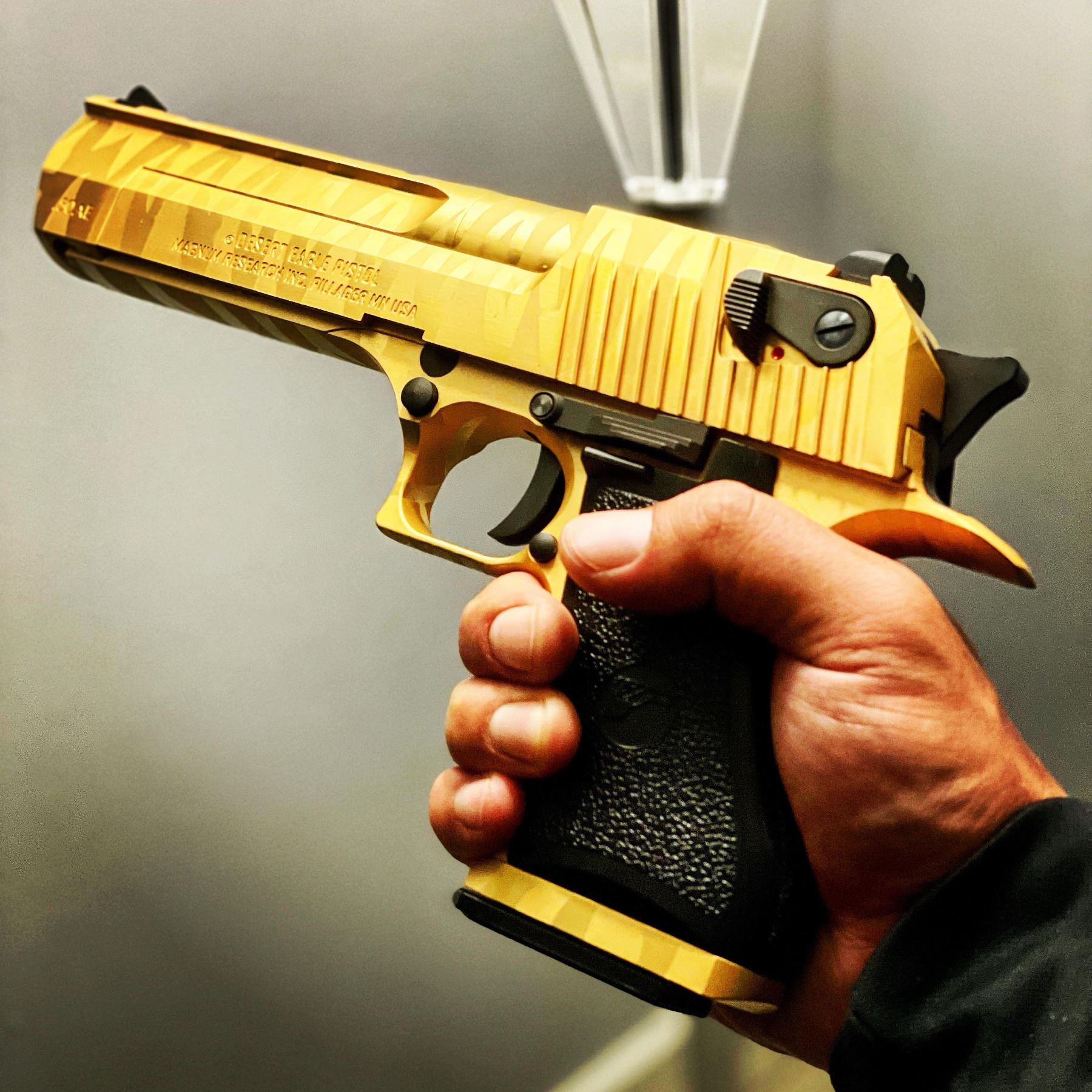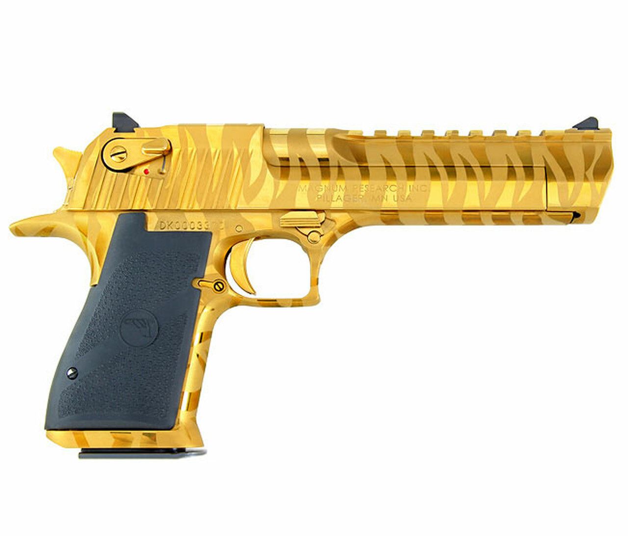 The Titanium Gold Desert Eagle with Tiger Stripes is a pistol is from Magnum Research. Its Titanium Gold finish with Tiger Stripes is a work of art that is unlike any pistol on the market.