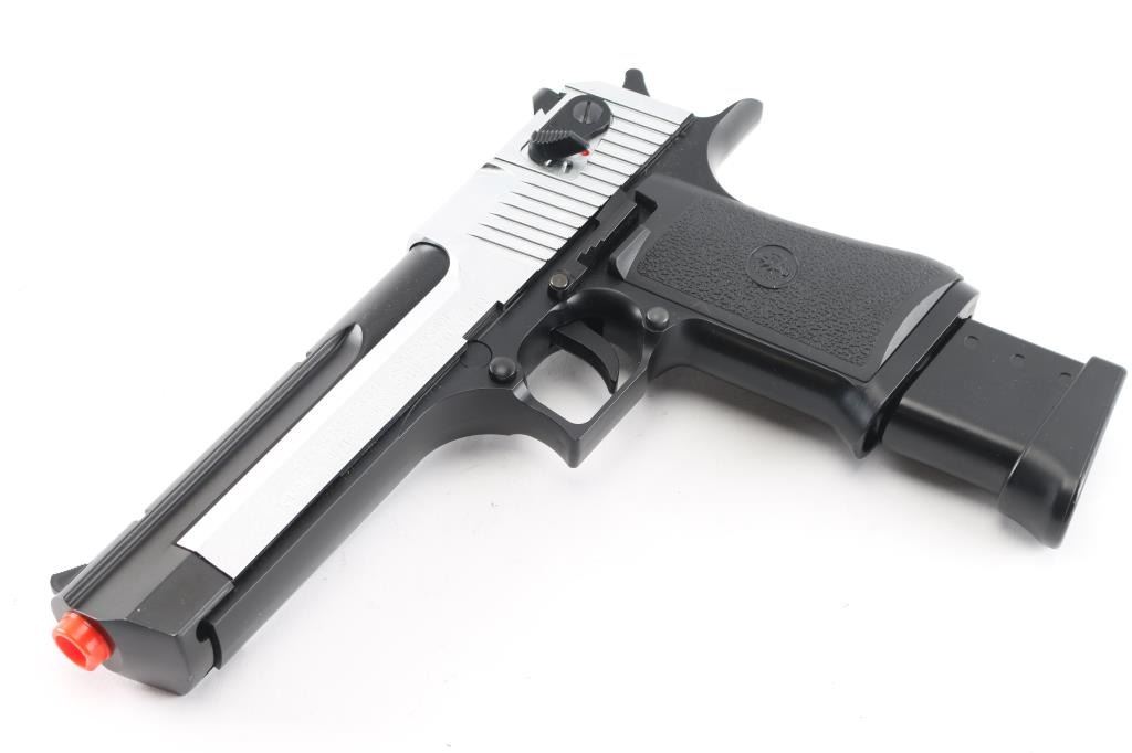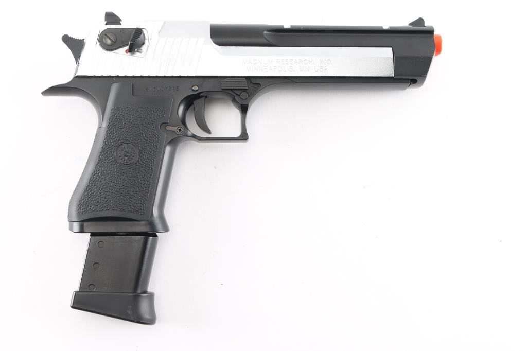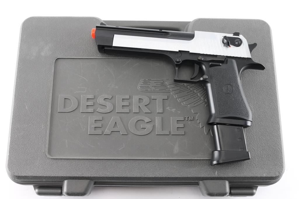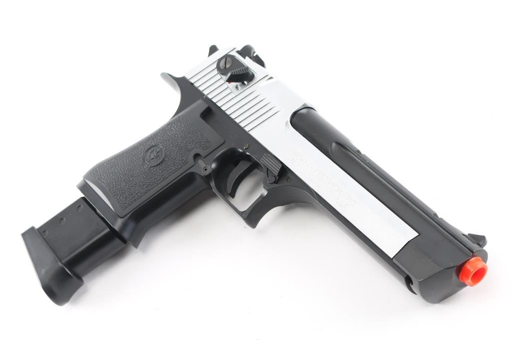 Magnum Research Licensed Desert Eagle CO2 GBB by KWC. Heavy weight metal alloy slide construction.Slip resistant rubberized grip. Licensed by Magnum Research Inc. / Cybergun with authentic trademarks and logos. Safe / semi-auto / full-auto fire modes w/ ambidextrous safety / fire selector. Co2 powered. Top of barrel rib dovetailed for sights/optics. Comes in original factory hard case with with paperwork. One magazine. SN: KWC406625. Like new condition.
